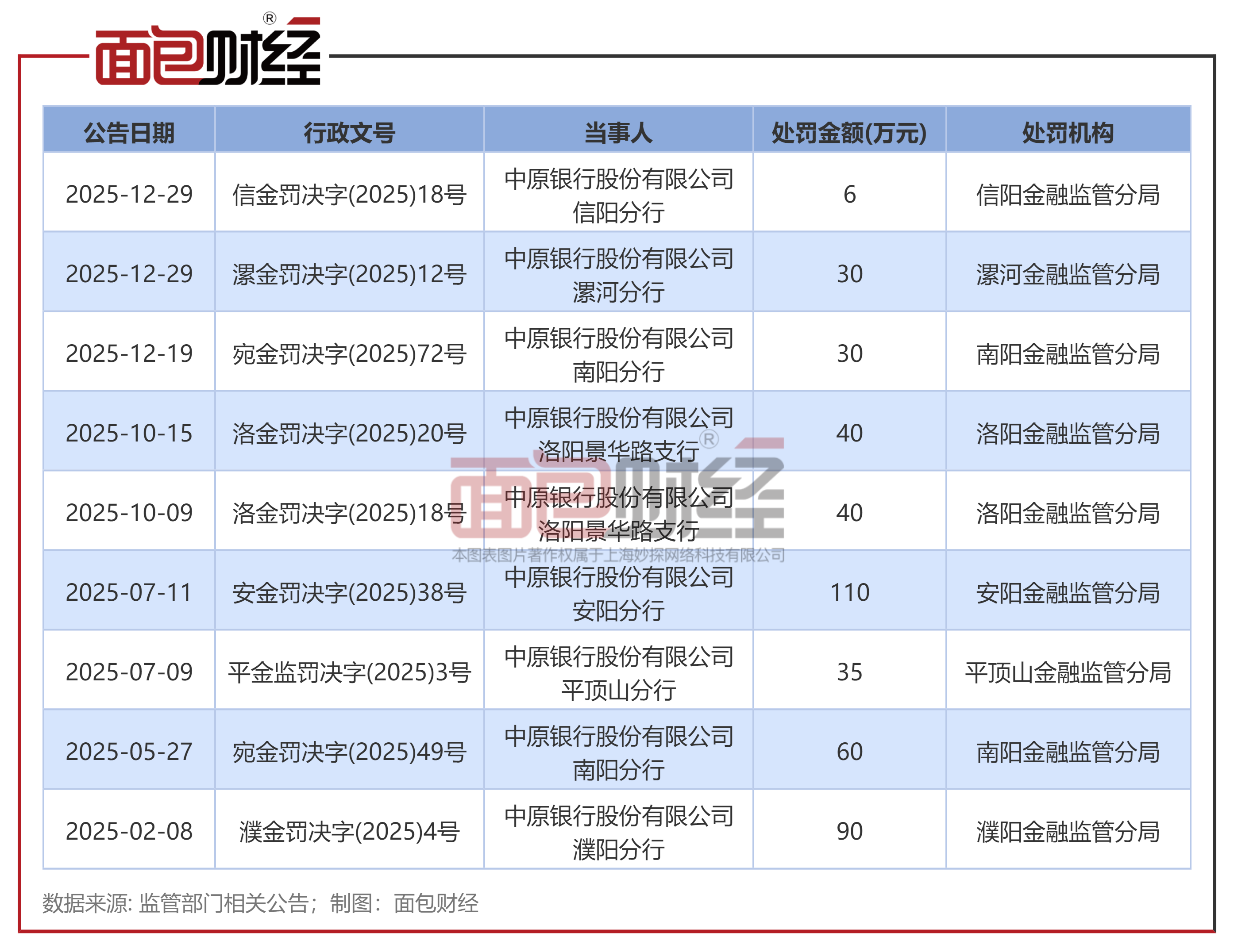 中原银行连收两张罚单,2025年以来已累计被罚款超440万元