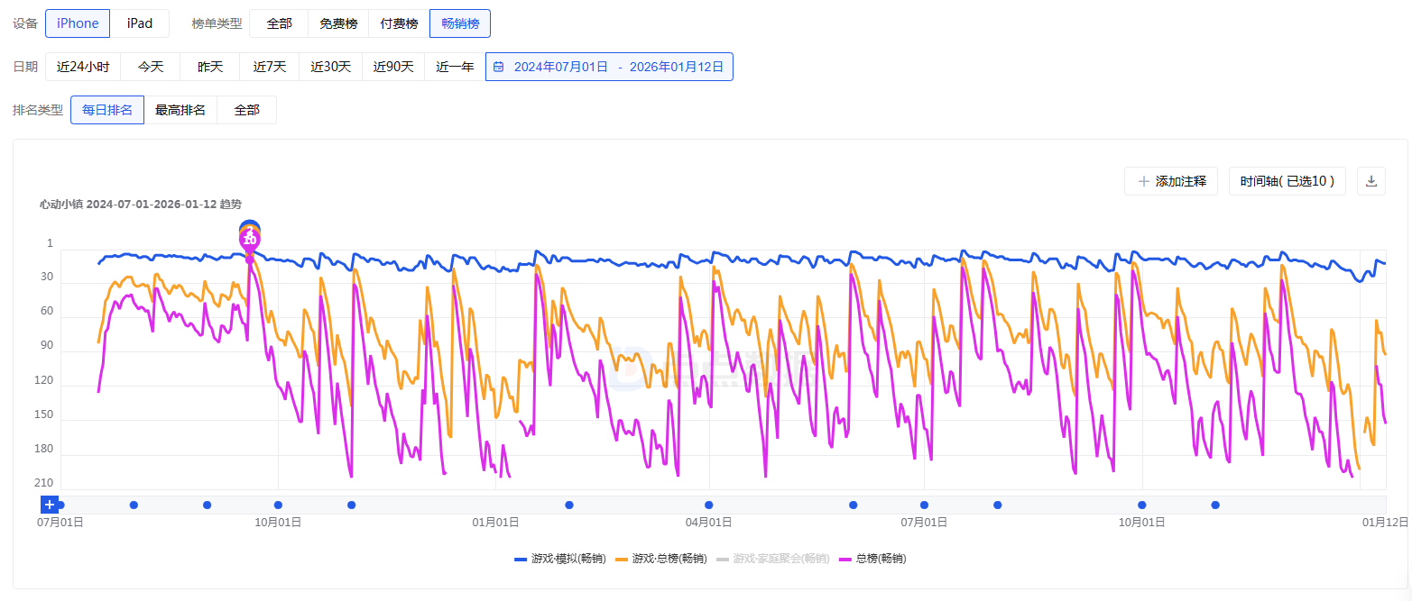根据全球移动应用、游戏数据监测服务商点点数据的监测,《心动小镇》国内版本上线以来在中国内地iOS游戏畅销榜排名最高于2024年9月达到第6名,此后排名整体保持平稳。