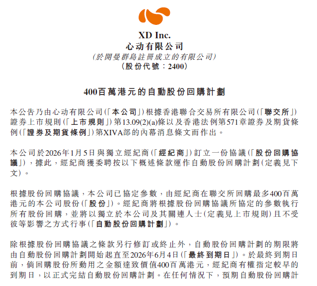 2026年1月5日,心动公司披露400百万港元的自动股份回购计划。