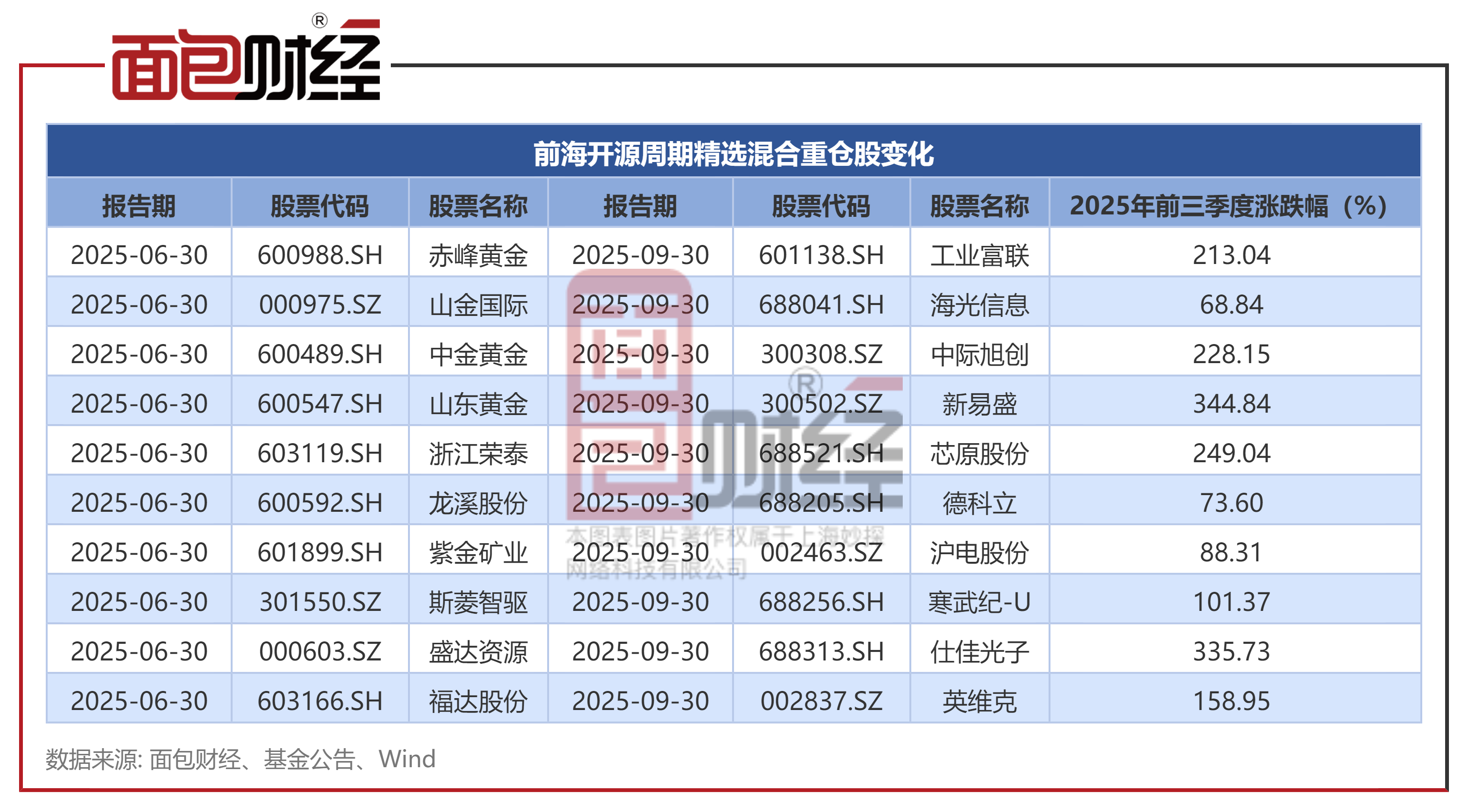 同时,该基金在三季度大幅调仓,前十大重仓股大变脸,减持黄金资源股,转向重点配置算力相关方向的通信、电子和机械等成长板块。