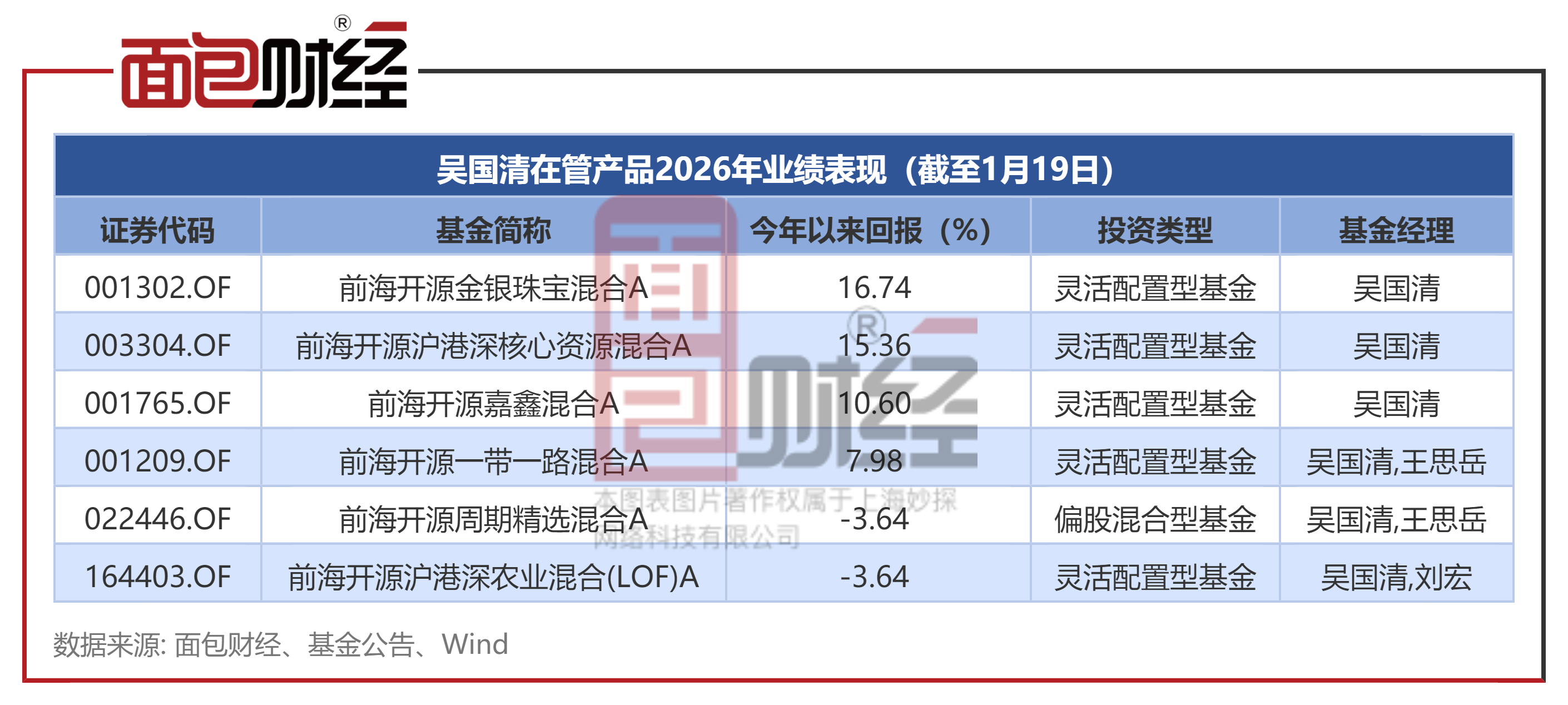 Wind数据显示,吴国清在管产品(初始基金口径)2026年业绩表现分化明显。截至2026年1月19日,前海开源金银珠宝混合A、前海开源沪港深核心资源混合A年内净值上涨超过15%。而前海开源周期精选混合A、前海开源沪港深农业混合(LOF)A年内净值下跌超过3%。