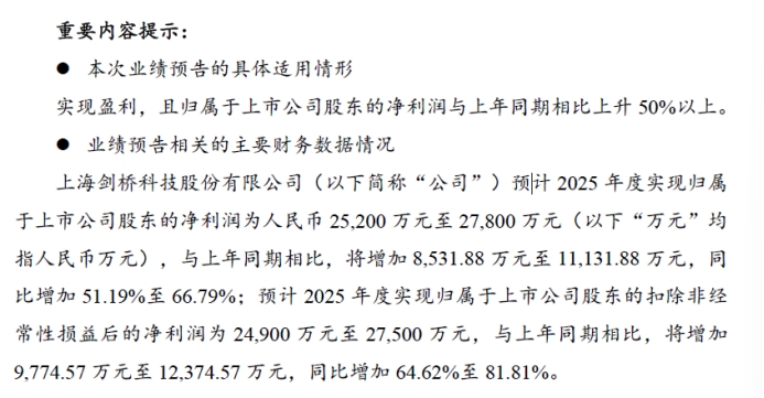 具体来看,剑桥科技预计2025年实现归属于上市公司股东的净利润为25,200 万元至27,800万元,与上年同期相比,将增加8,531.88 万元至11,131.88 万元,同比增加51.19%至66.79%。