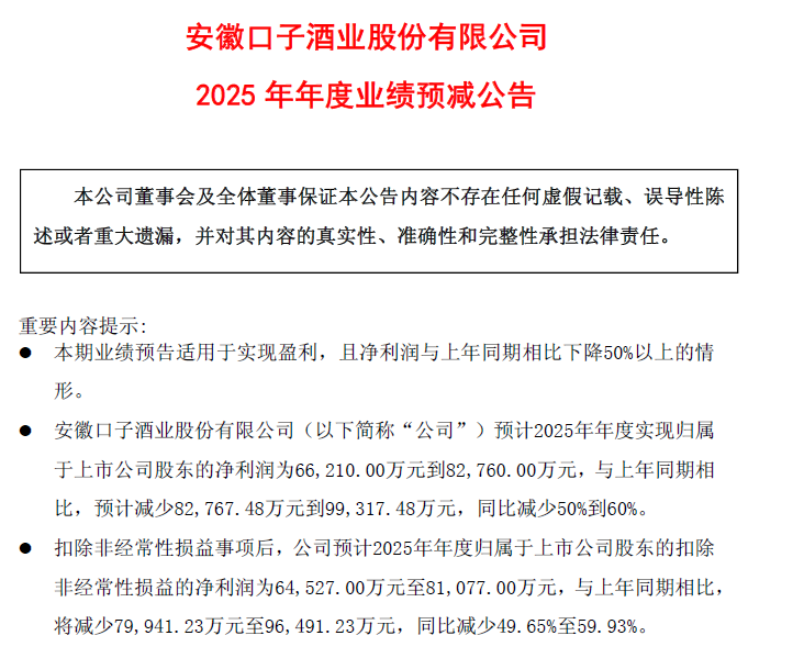 口子窖预计2025年年度实现归属于上市公司股东的净利润为66,210.00万元到82,760.00万元,与上年同期相比,预计减少82,767.48万元到99,317.48万元,同比减少50%到60%。