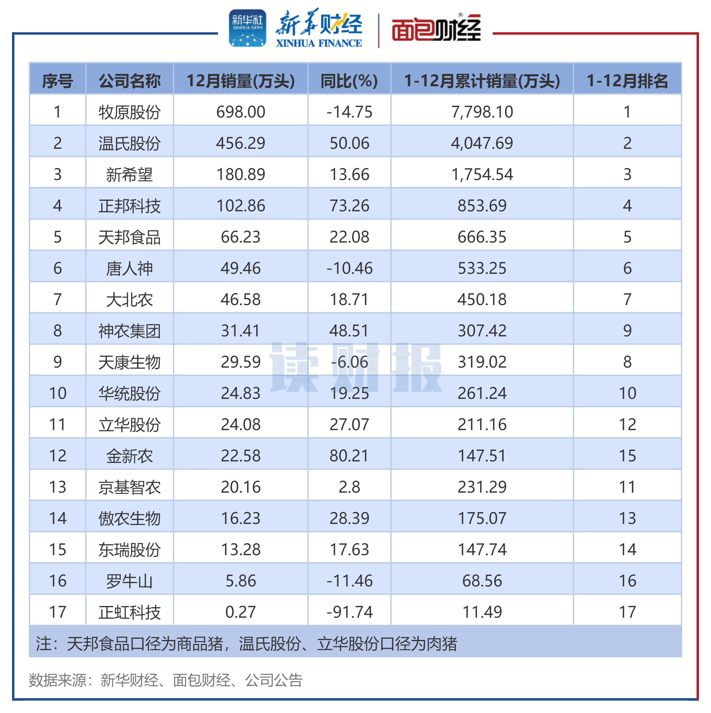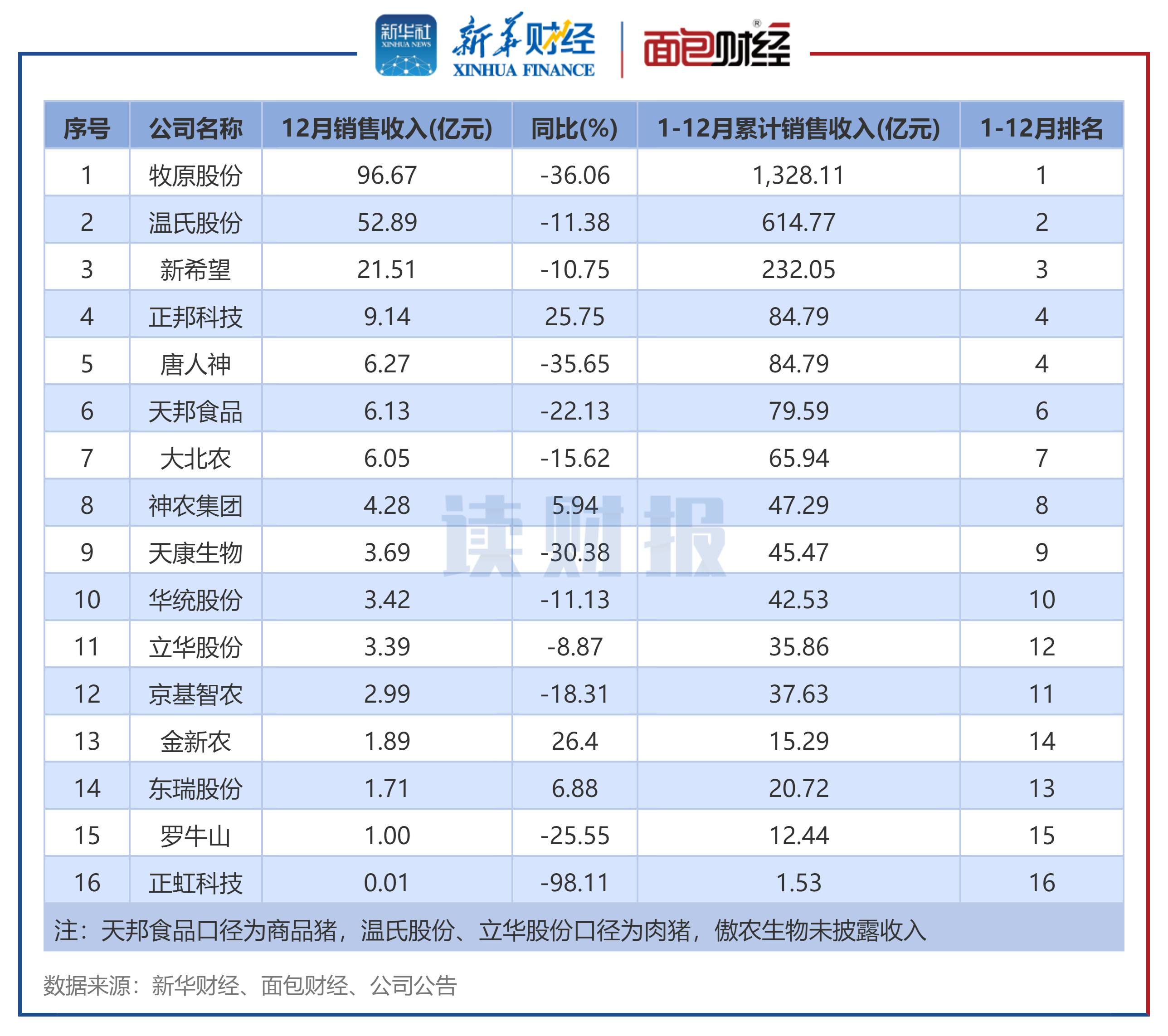 近期,生猪养殖企业12月的销售数据陆续披露。新华财经和面包财经研究员在剔除部分数据披露不全的上市猪企后,以沪、深两大交易所主要上市生猪养殖企业为样本,分别统计其生猪销售收入、销量。