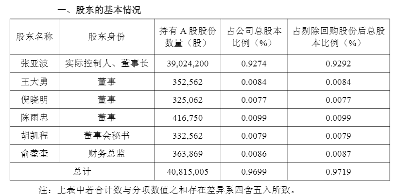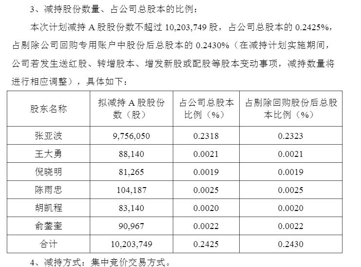 公告显示,三花智控本次拟减持的股东包括实际控制人、董事长张亚波,董事王大勇、倪晓明、陈雨忠,董事会秘书胡凯程,财务总监俞蓥奎,6人拟合计减持1020.37万股,占公司总股本的0.2425%。减持原因为个人资金需求。