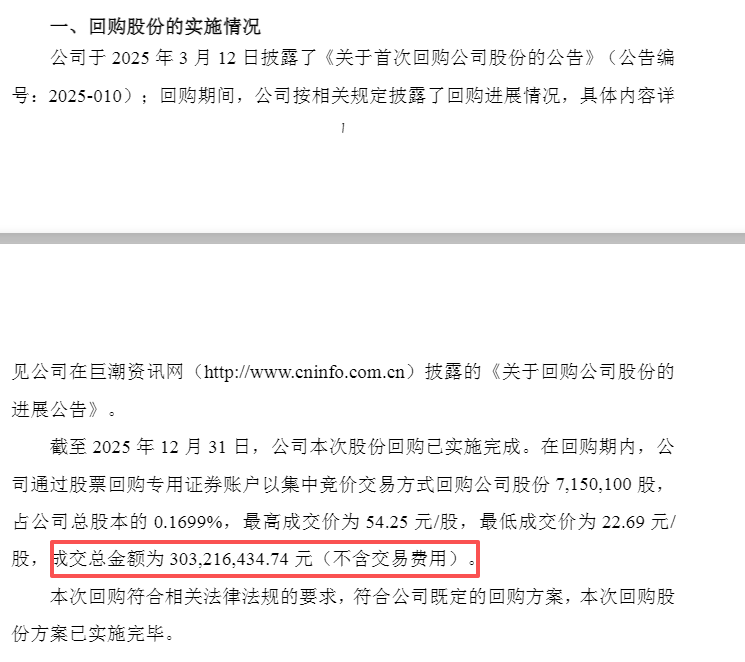 截至2025年12月31日,公司本次股份回购已实施完成。在回购期内,公司通过股票回购专用证券账户以集中竞价交易方式回购公司股份7,150,100股,占公司总股本的0.1699%,最高成交价为54.25元/股,最低成交价为22.69元/股,成交总金额为303,216,434.74元(不含交易费用)。