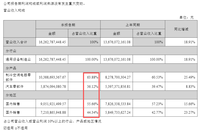 根据2025年半年报,三花智控来自制冷空调电器零部件、汽车零部件业务的收入占比分别为63.88%、36.12%。期间,公司约44.34%的收入来自于国外销售。