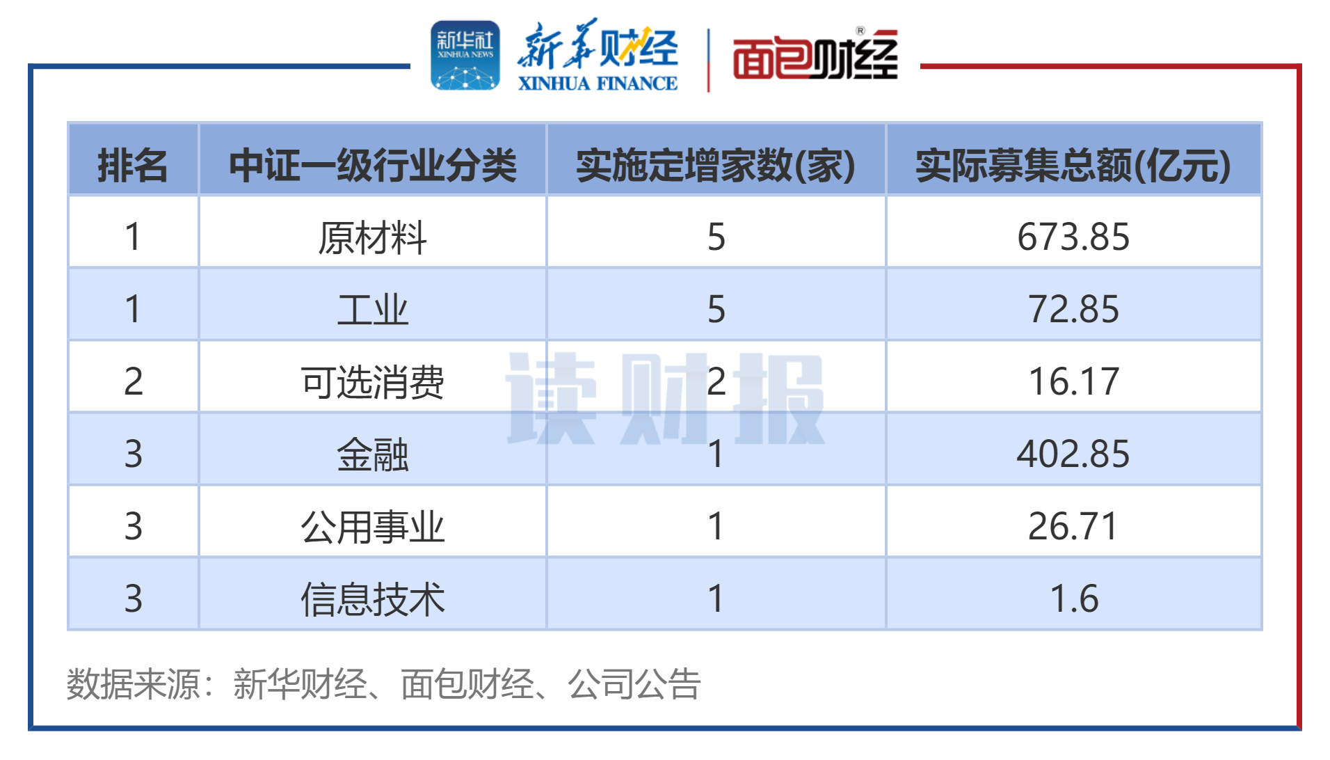 从行业分布来看,以中证行业统计,原材料行业、工业行业均实施5起定增,其中原材料行业募资规模合计约673.85亿元,规模居首。