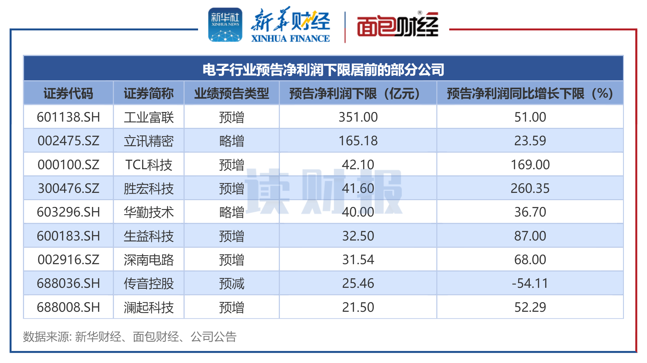 数据显示,工业富联、立讯精密、TCL科技的预告净利润规模下限位列前三。