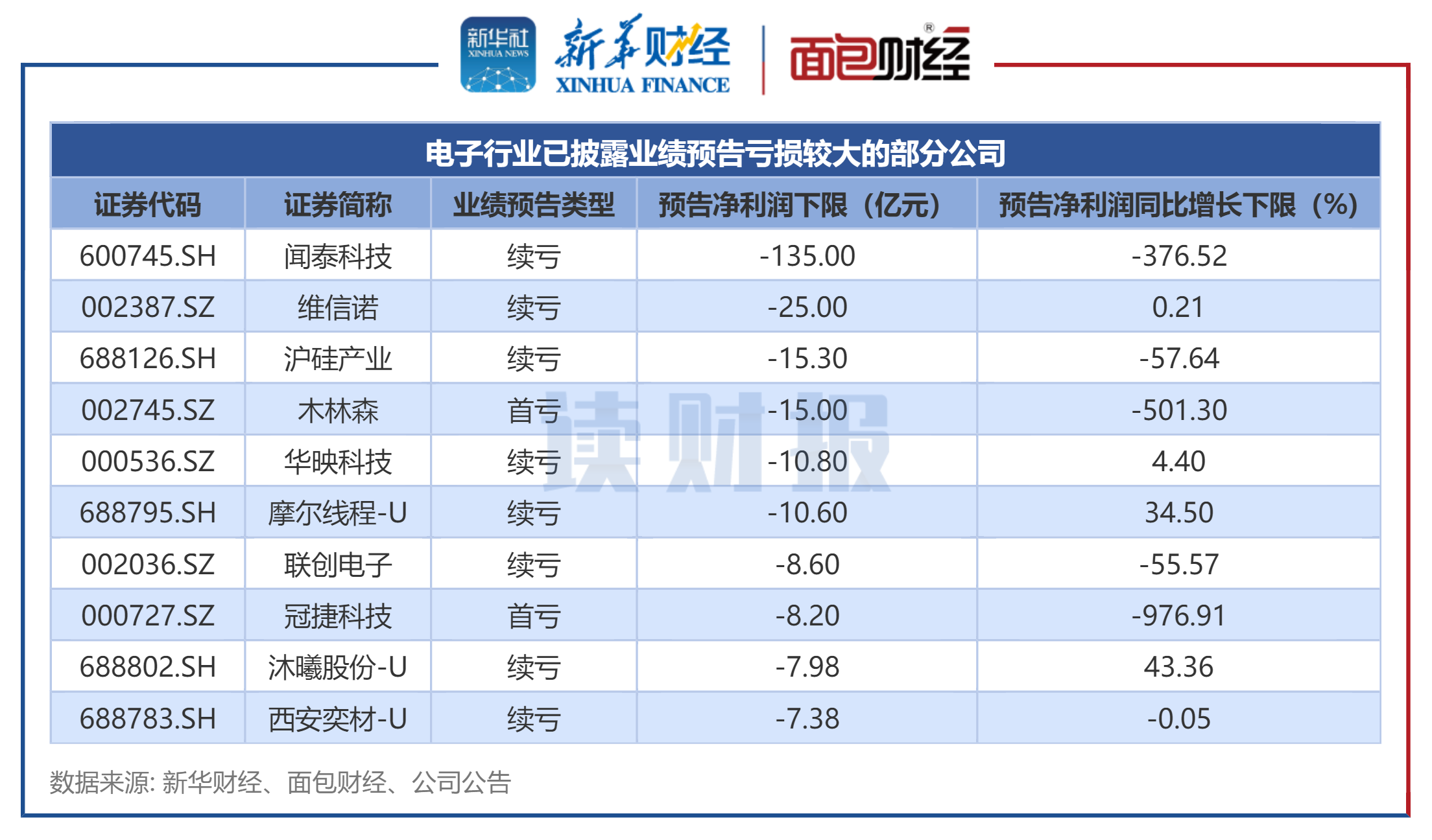 统计数据显示,电子行业所有公布业绩预告的公司中有130家亏损。其中,预告净利润下限排名前三位的公司分别是闻泰科技、维信诺及沪硅产业。