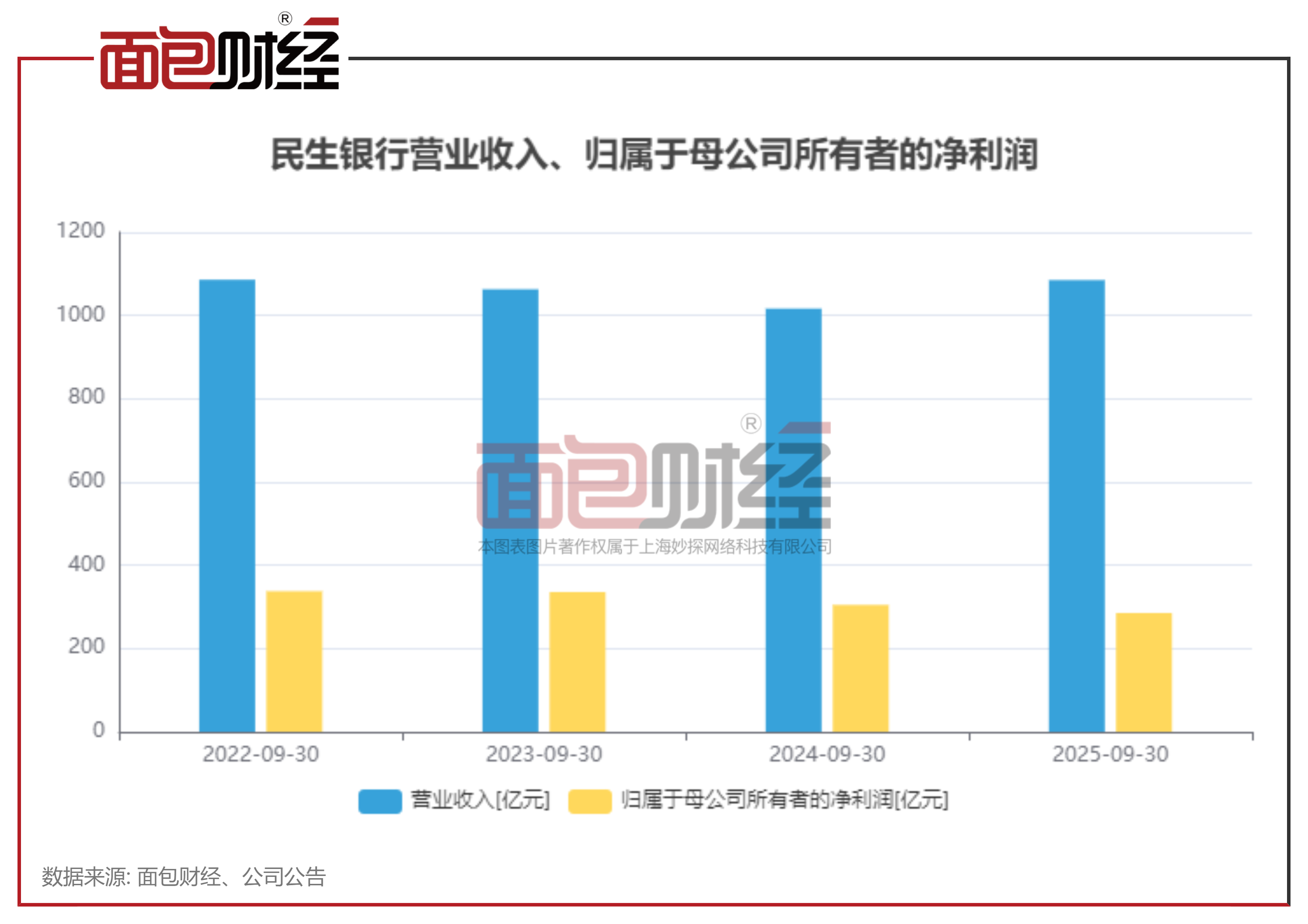 三季报显示,民生银行营业收入达1085.09亿元,同比增长6.74%;归母净利润285.42 亿元,同比下降6.38%。