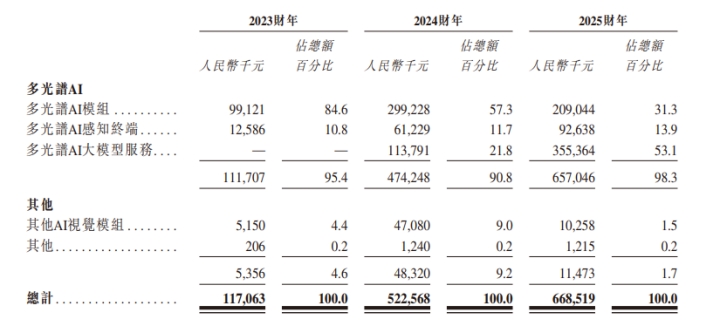 2025年,多光谱AI大模型服务收入大幅增长至3.55亿元,占总收入的53.1%,跃升为第一大收入来源;多光谱AI模组收入2.09亿元,占比31.3%;多光谱AI感知终端占比13.9%。