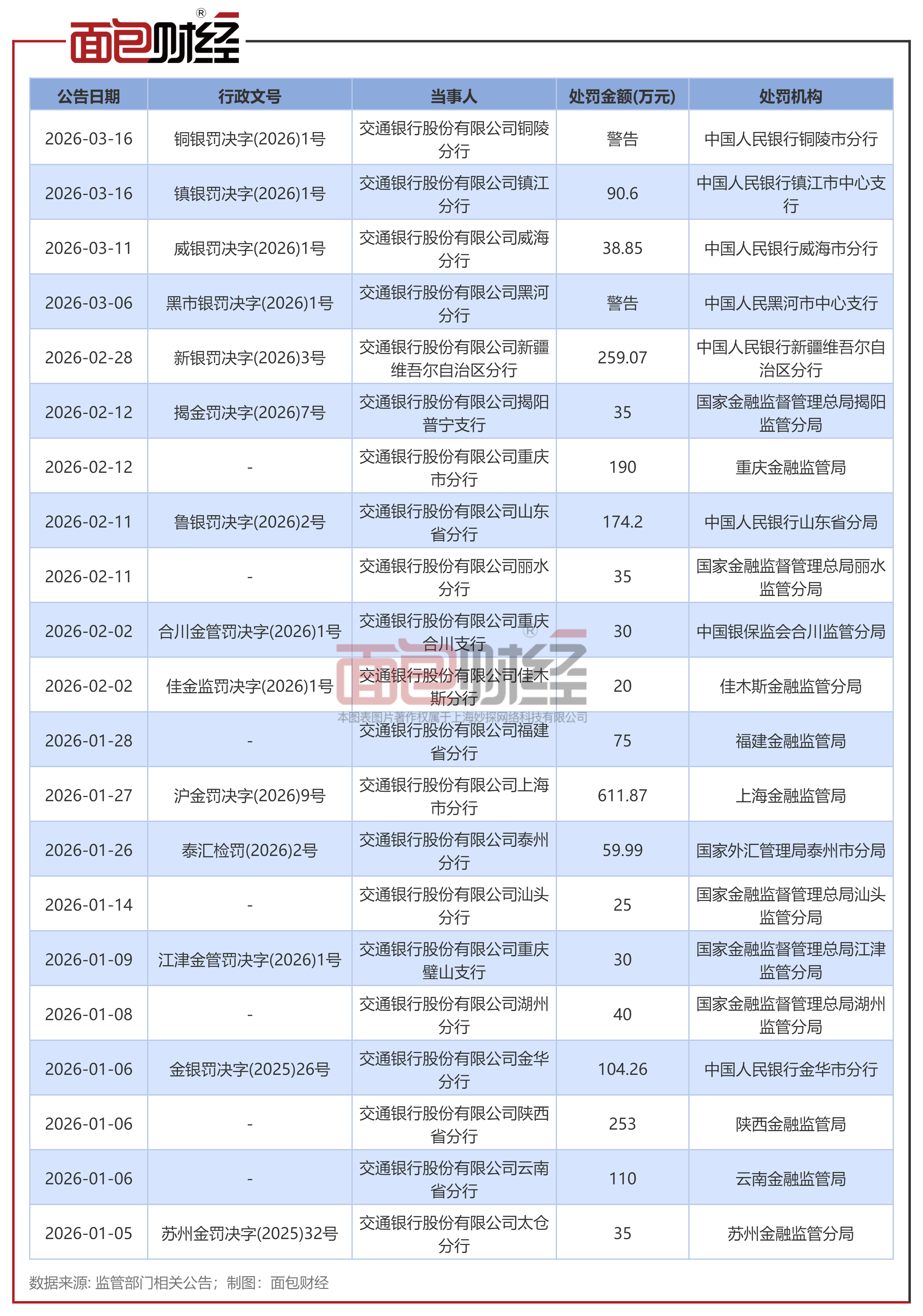 交通银行:2026年以来累计被罚没超2200万元