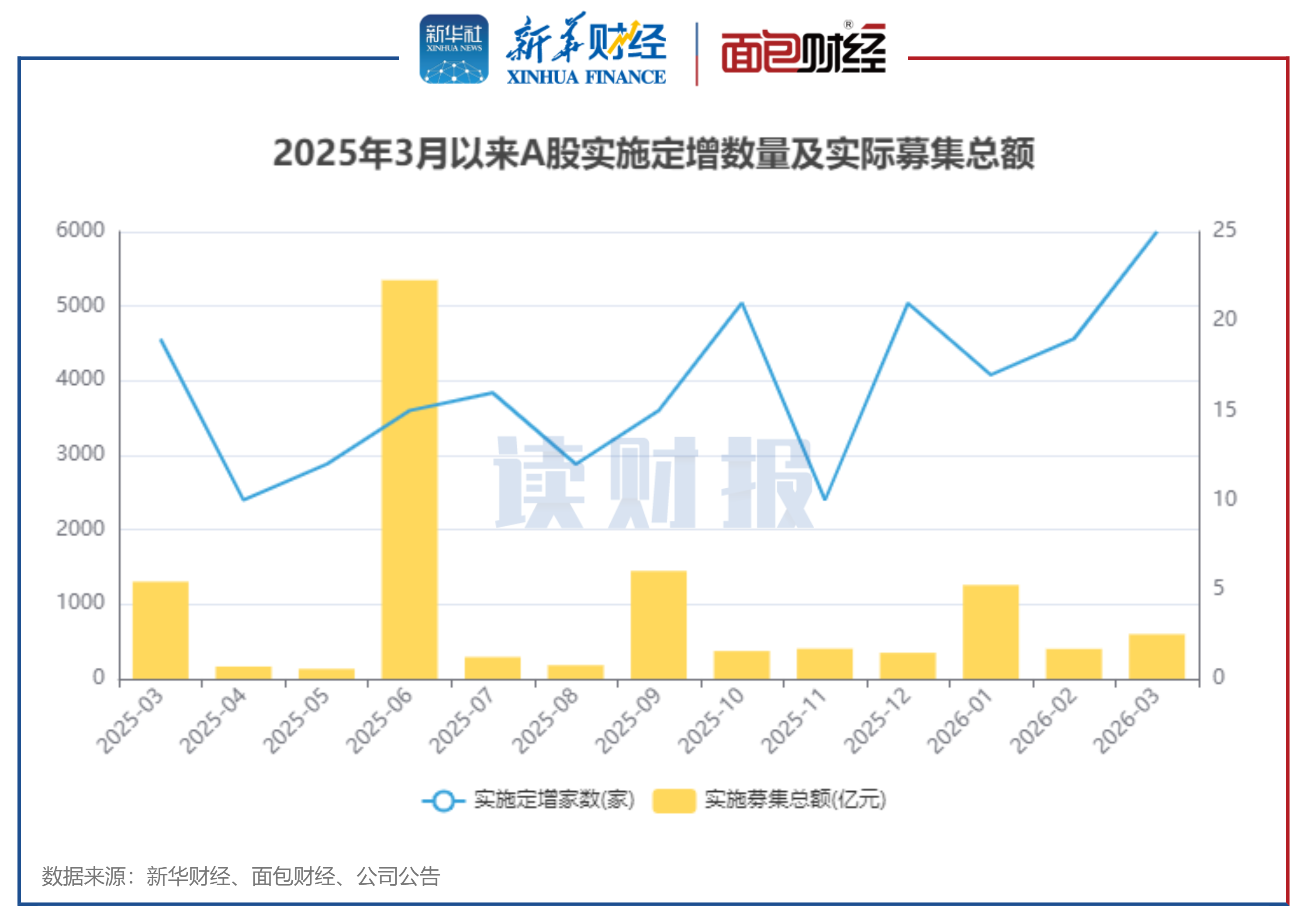 统计显示,2026年3月,A股上市公司共计实施定增25起,同比上升32%;实际募资总额约598.47亿元,同比下降54%。中国神华、厦门港务的募资规模相对靠前。