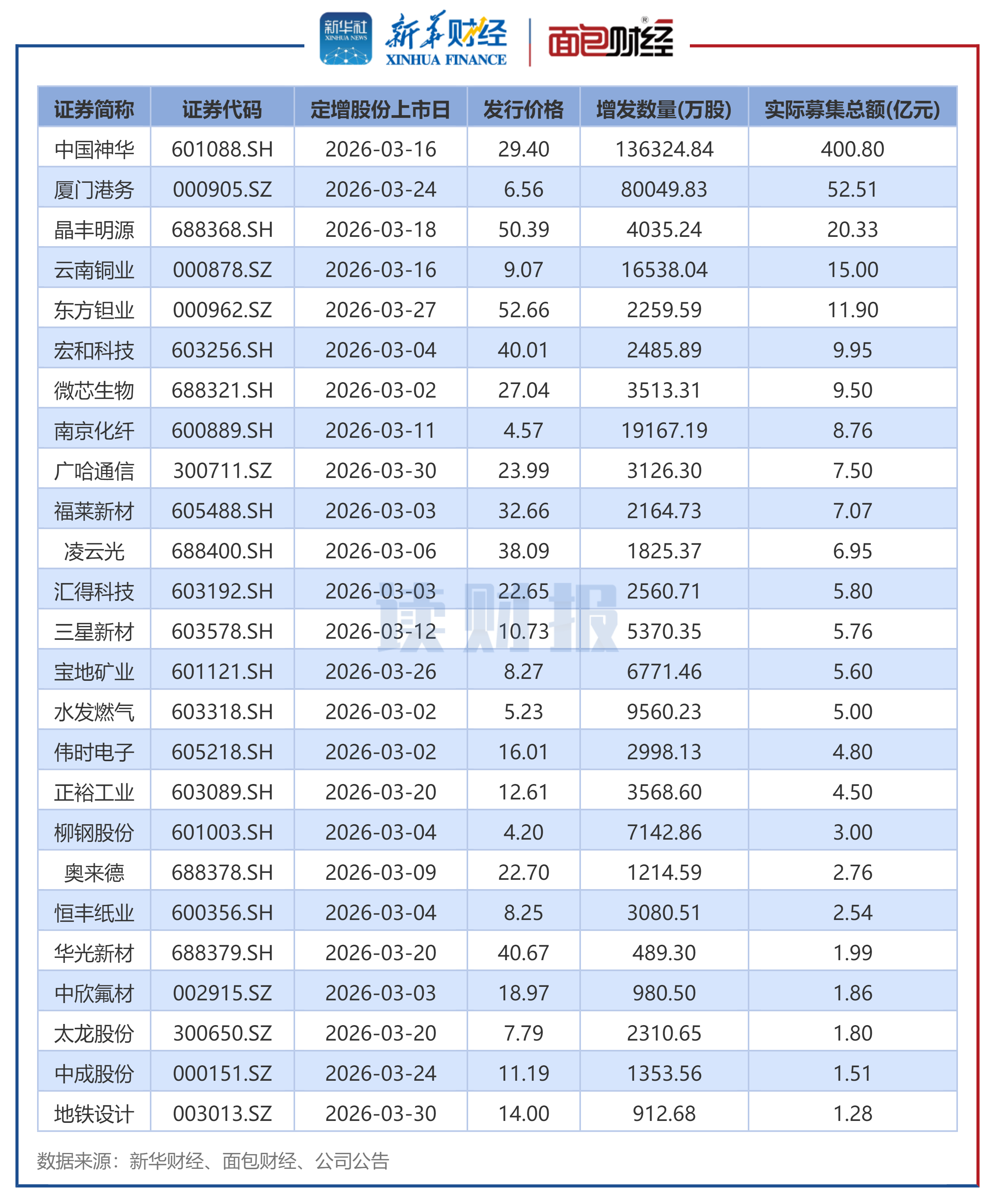 2026年3月实施定增的上市公司中,中国神华的实际募资额排在首位。中国神华新增股份数量为13.63亿股,发行价格为29.4元/股,实际募资总额为400.8亿元,募集资金净额拟用于购买国家能源集团持有的国源电力100%股权、新疆能源100%股权、化工公司100%股权、乌海能源100%股权、平庄煤业100%股权、神延煤炭41%股权、晋神能源49%股权、包头矿业100%股权、航运公司100%股权、煤炭运销公司100%股权、港口公司100%股权,并以支付现金的方式购买西部能源持有的内蒙建投100%股权。