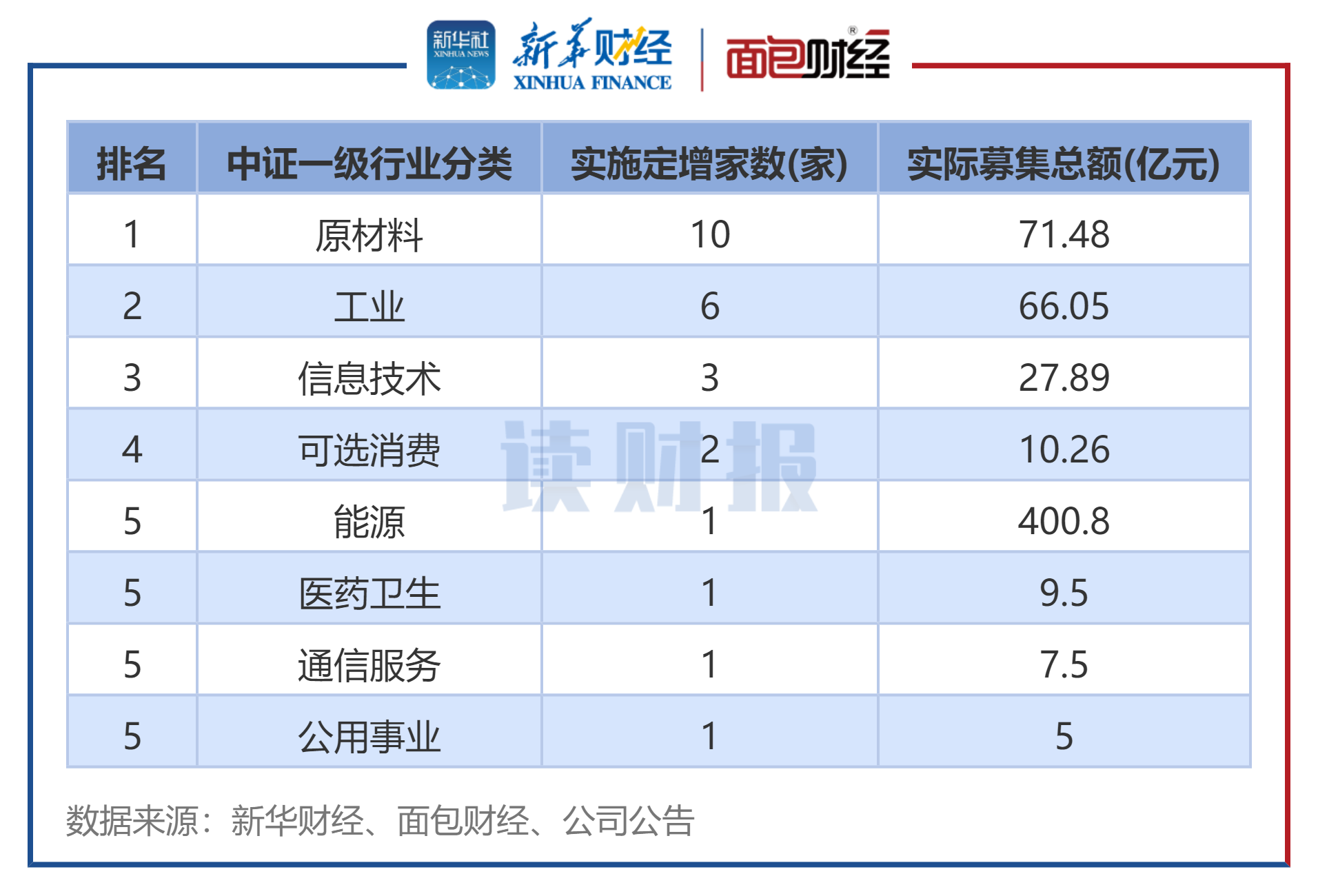 从行业分布来看,以中证行业统计,原材料行业实施10起定增,募资规模合计约71.48亿元;其次是工业行业,有6起定增实施;信息技术行业排名第三,有3起定增实施。