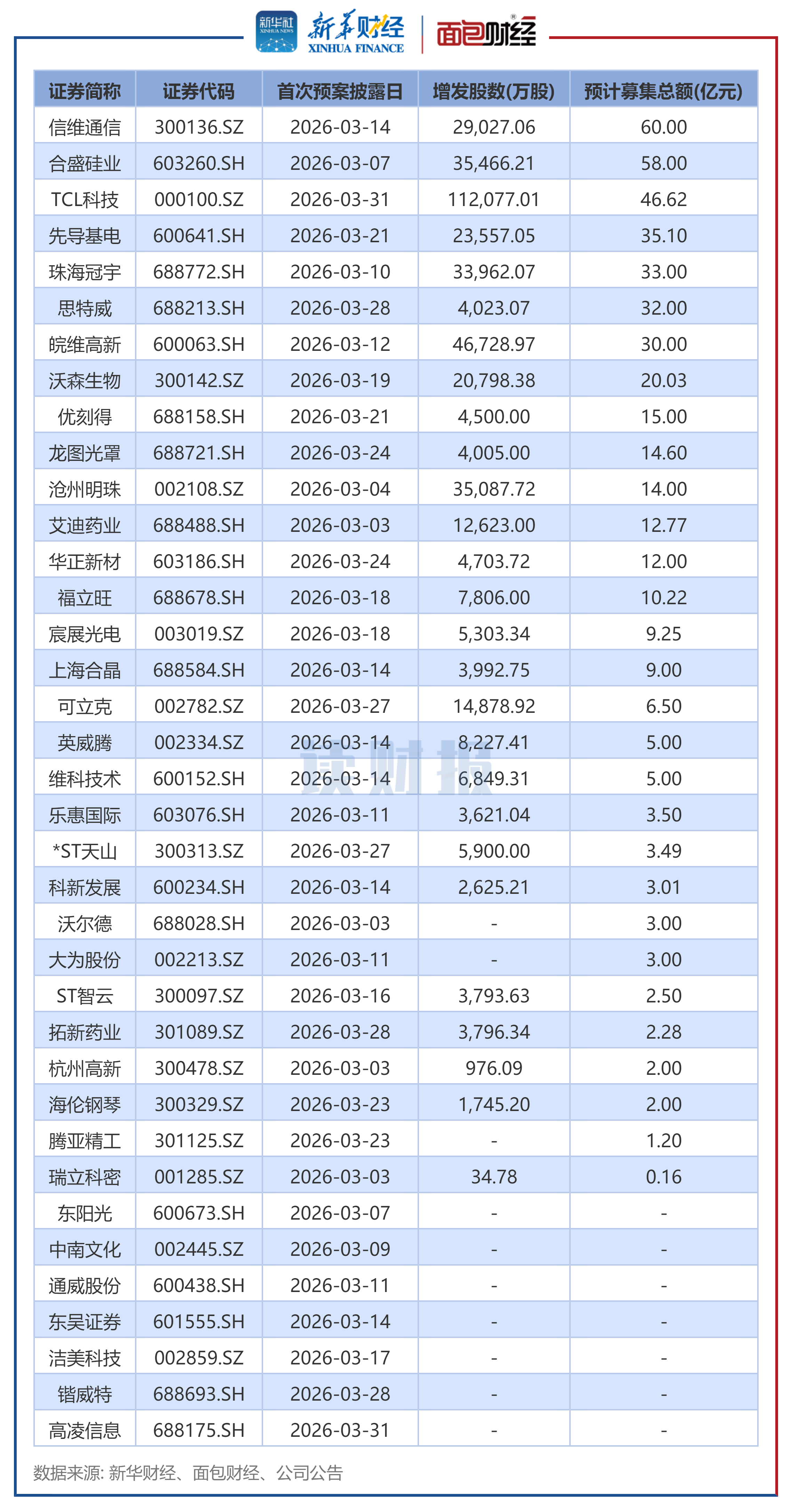 按照首次披露预案日口径统计,2026年3月A股上市公司定增预案发布数量共计37起,拟募资规模约454.23亿元,同比下降93%。其中,信维通信、合盛硅业等企业拟募资规模相对靠前。