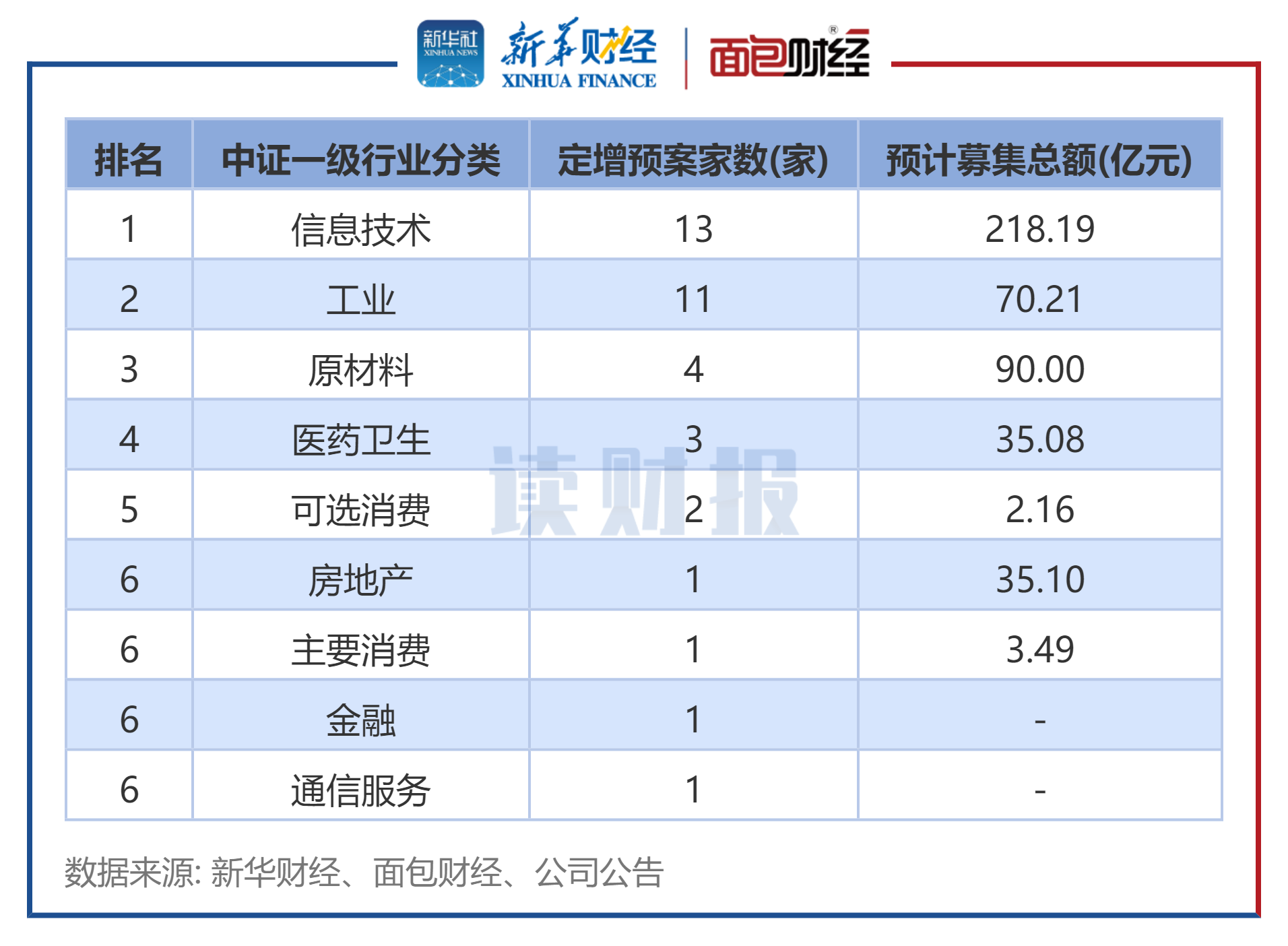 从行业分布来看,以中证行业统计,2026年3月,信息技术行业发布13起定增预案,拟募资额合计218.19亿元;其次是工业行业,有11起定增预案;原材料行业排名第三,有4起定增预案。