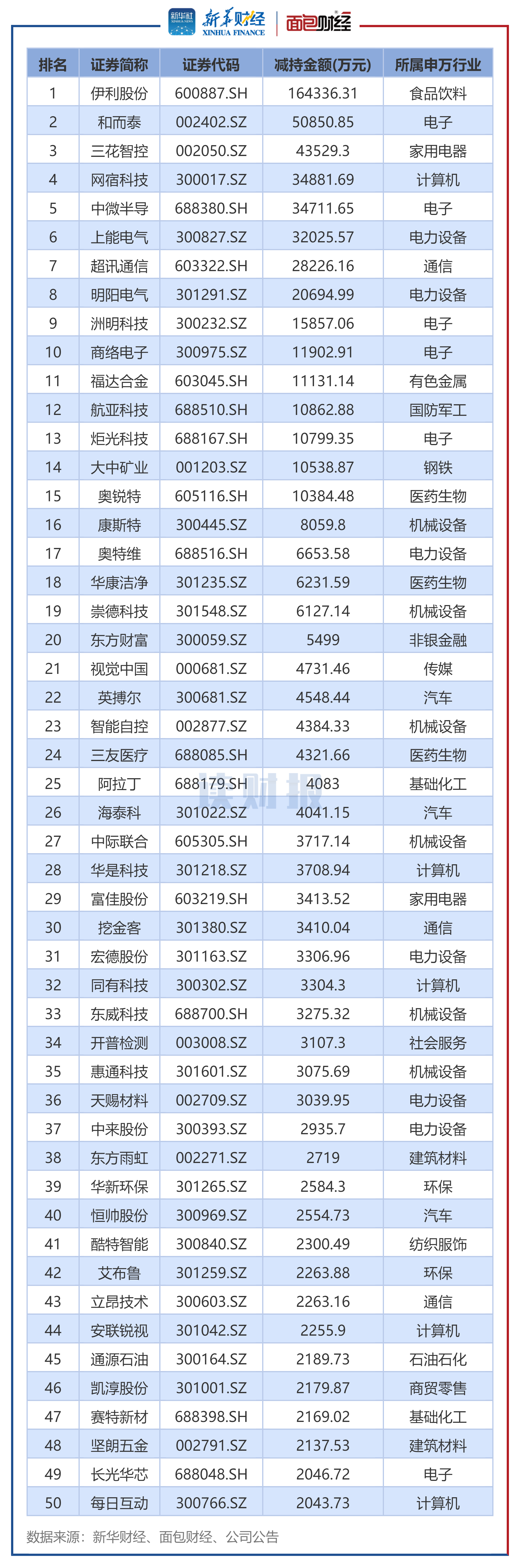 伊利股份、和而泰、三花智控减持金额居前