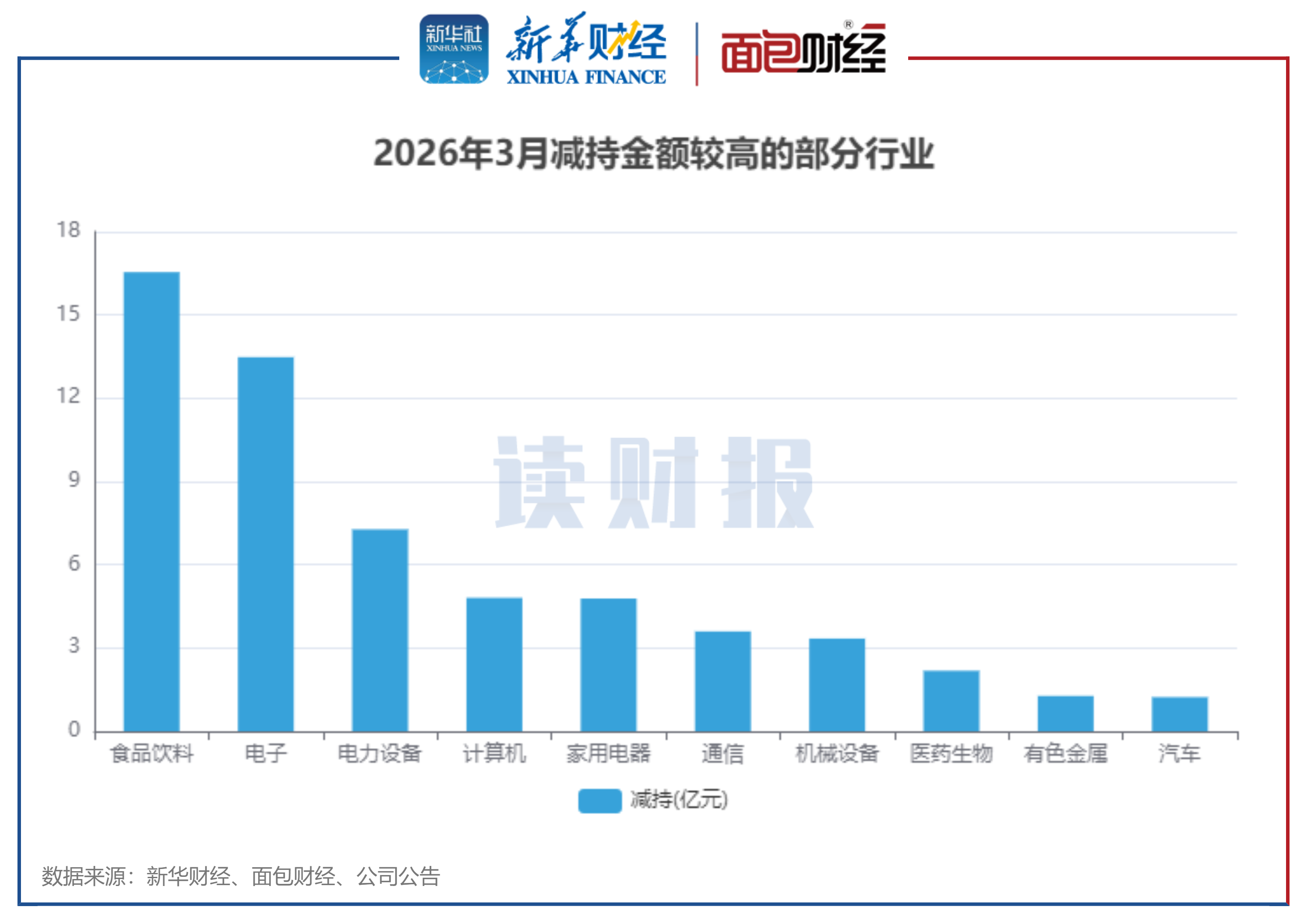 3月份,各行业中,食品饮料行业减持金额居首位,传媒行业增持金额最多。