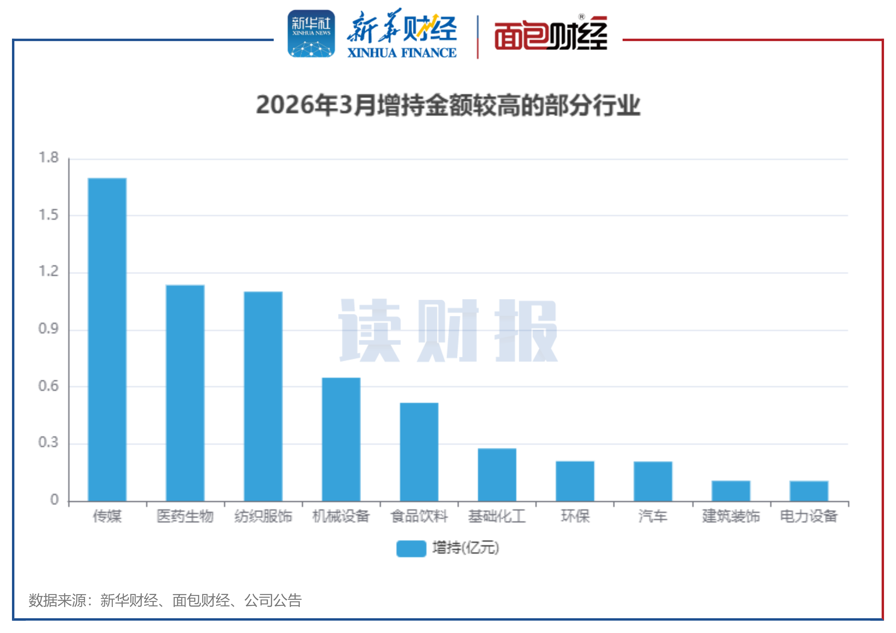 从行业来看,3月份传媒行业的增持金额排在首位,约为1.7亿元;医药生物行业增持金额排在第二,约为1.14亿元;纺织服饰行业增持金额也在前列,约为1.1亿元。