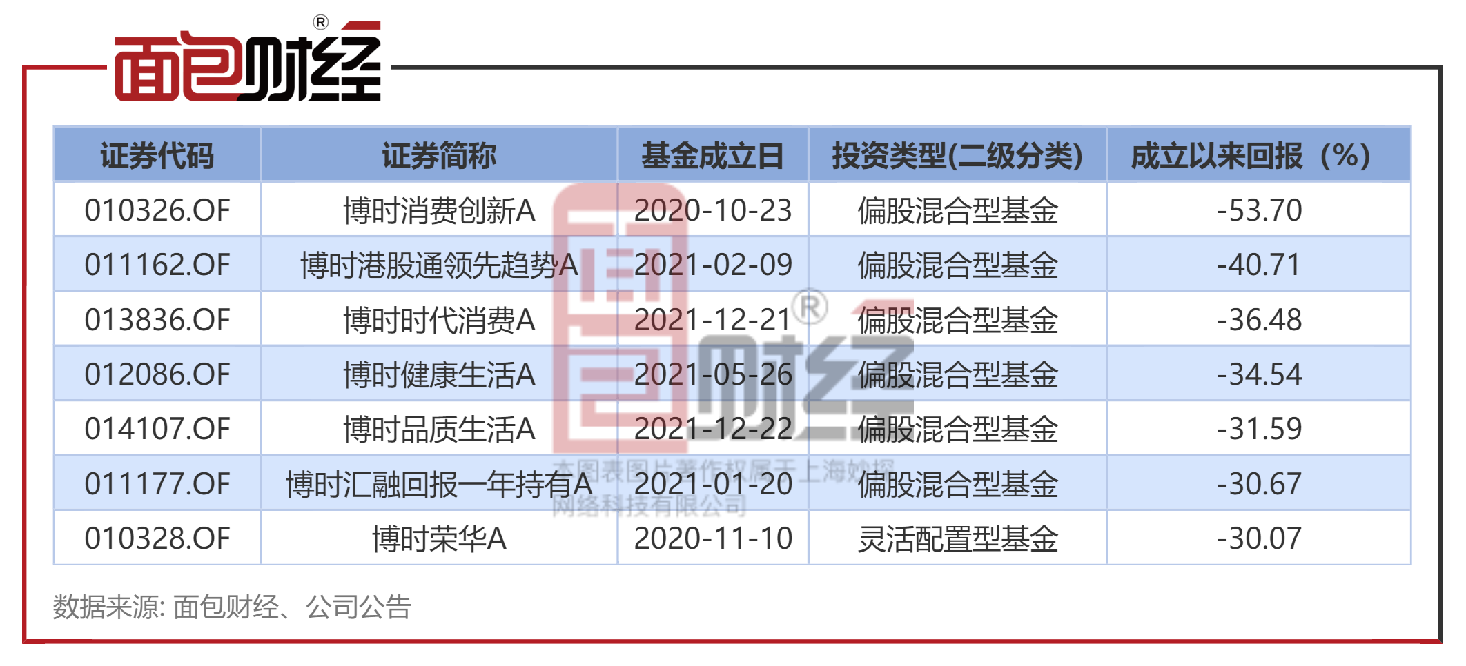 根据不完全统计,截至2026年4月13日(下同),博时基金在管的7只主动权益产品(初始基金口径)成立以来净值累计下跌超过30%。其中,博时消费创新A成立以来净值下跌53.7%,跑输业绩比较基准超过40个百分点。