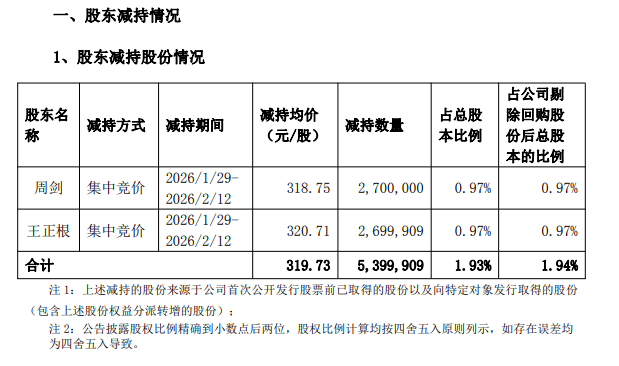 伴随股价强势上涨,迈为股份于2026年1月7日发布控股股东减持股份预披露公告。公告显示,合计持有迈为股份109,537,827 股的公司控股股东周剑及王正根计划以集中竞价或大宗交易的方式减持公司股份,减持数量不超过 5,400,000 股,即不超过公司当时总股本剔除回购专用账户中的股份数量后的1.94%。