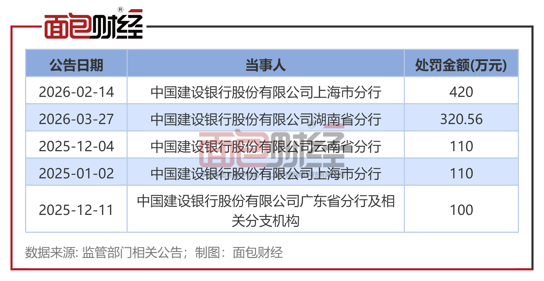 2026年3月27日,建行湖南省分行因违反金融统计相关规定、违反账户管理规定等8项违规,被中国人民银行湖南省分行处以罚款320.56万元。