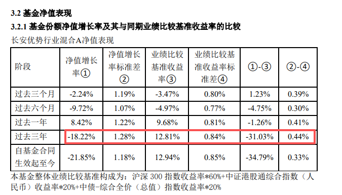 根据近日披露的基金一季报,截至报告期末,长安优势行业混合A过去三年净值下跌18.22%,跑输业绩基准31.03个百分点。
