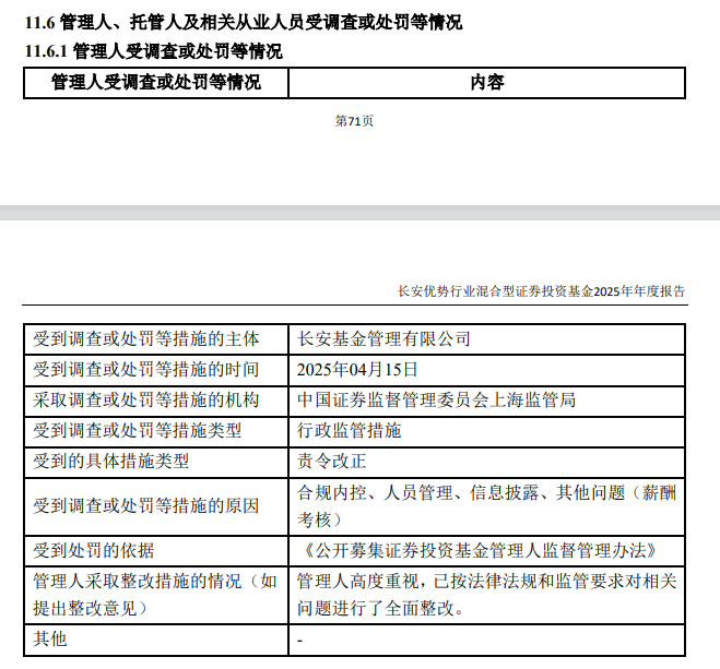 值得注意的是,2025年,长安基金曾因合规内控、人员管理、信息披露、其他问题(薪酬考核)原因被中国证券监督管理委员会上海监管局采取行政监管措施,被要求责令改正。