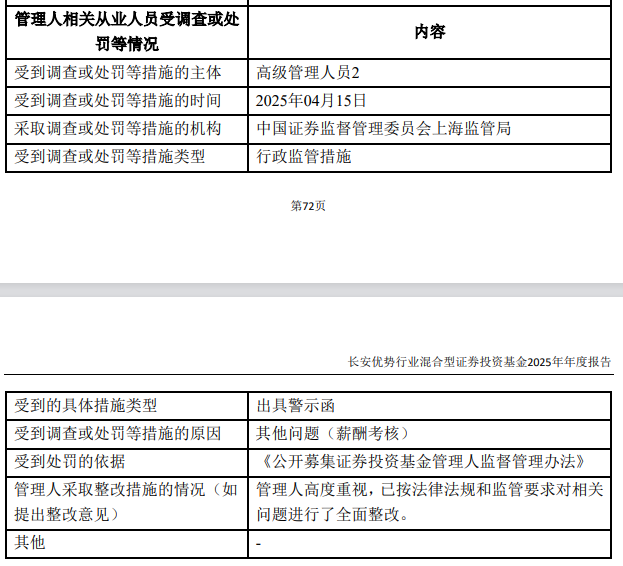 值得注意的是,长安基金2025年曾因合规内控、人员管理、信息披露、其他问题(薪酬考核)原因被中国证券监督管理委员会上海监管局采取行政监管措施,被要求责令改正。