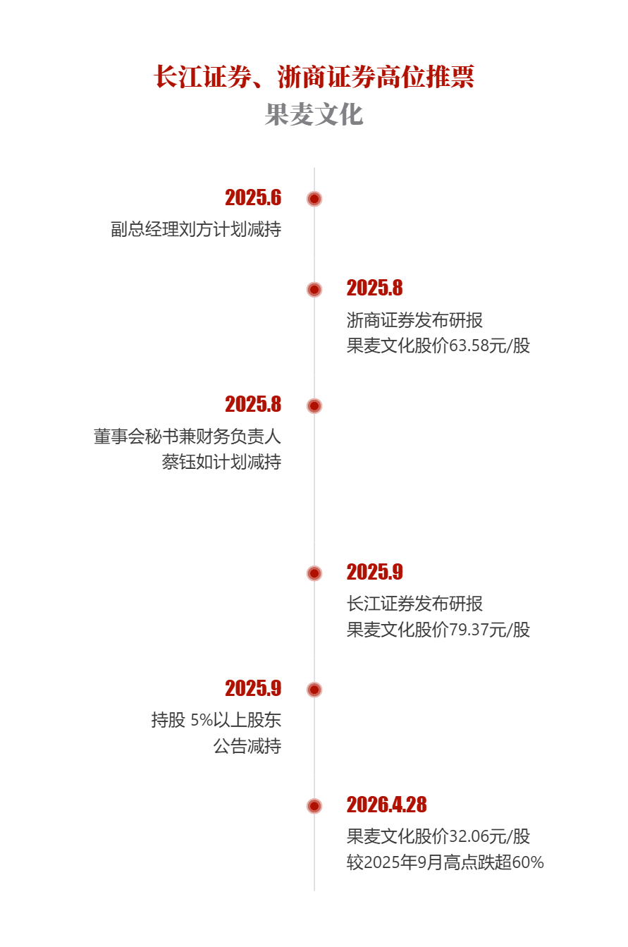 在前期股价大涨、高管已披露减持计划的背景下,浙商证券、长江证券分别于2025年8月和9月发布研报,给予果麦文化“买入”评级,但均未对股东减持风险作充分提示。