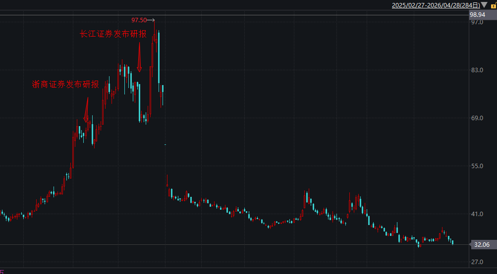 2024年9月至2025年9月的1年间,果麦文化股价最高上涨超过4倍,于2025年9月24日最高达到97.5元/股(前复权)。此后,公司股价快速下探,截至2026年4月28日收盘股价已跌至不足35元/股。