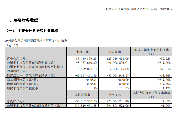 目前,果麦文化股价已自2025年9月高点下跌超六成。同时,果麦文化2025年业绩由盈转亏,2026年一季度亏损扩大。