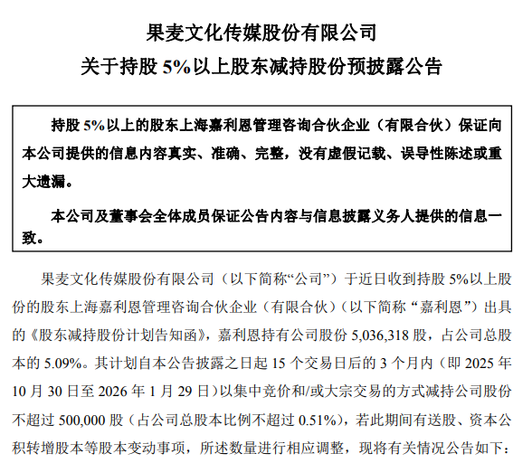 到了2025年9月30日,果麦文化再次披露持股 5%以上股东减持股份预披露公告。股东嘉利恩持有公司股份5,036,318 股,占公司总股本的 5.09%,其计划自公告披露之日起 15 个交易日后的3 个月内以集中竞价和/或大宗交易的方式减持公司股份不超过 500,000 股(占公司总股本比例不超过 0.51%)。