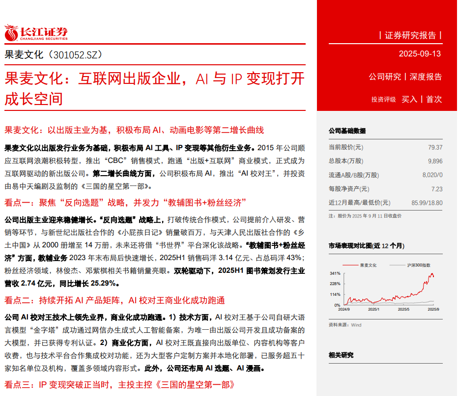 长江证券于2025年9月13日发布深度研报《果麦文化:互联网出版企业,AI 与 IP 变现打开成长空间》。研报提出了三大看点,包括看点一:聚焦“反向选题”战略,并发力“教辅图书+粉丝经济”;看点二:持续开拓 AI 产品矩阵,AI 校对王商业化成功跑通;看点三:IP 变现突破正当时,主投主控《三国的星空第一部》。