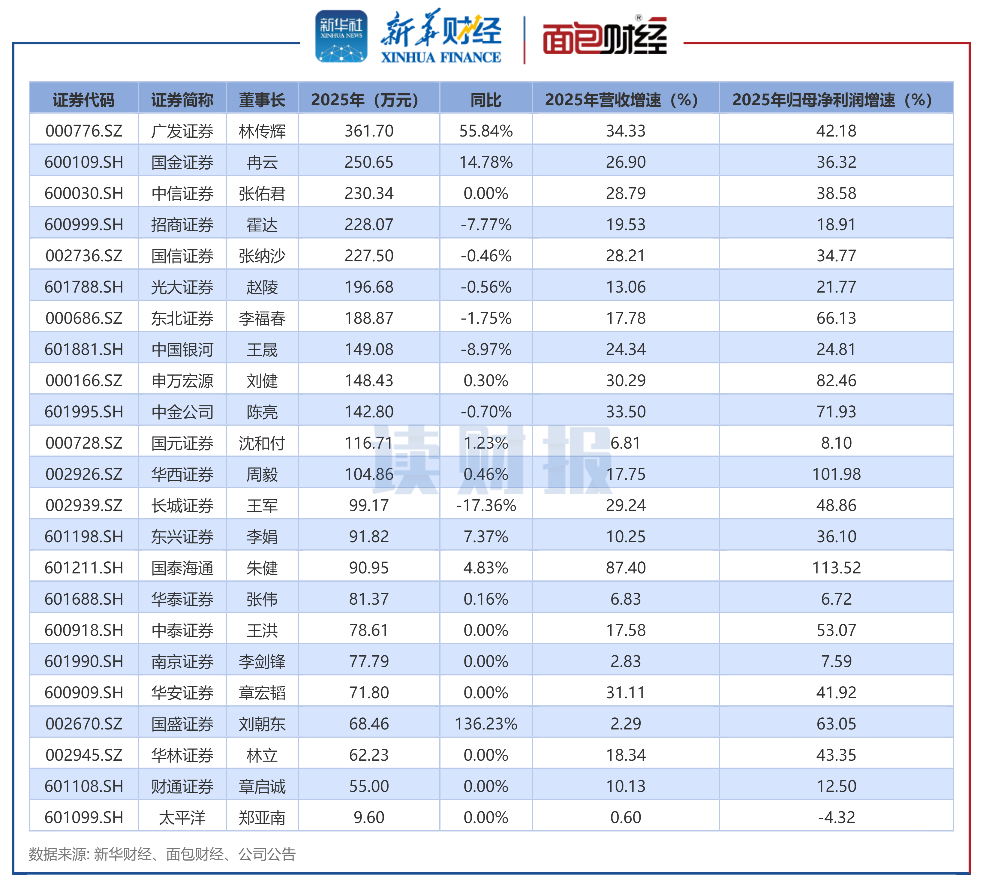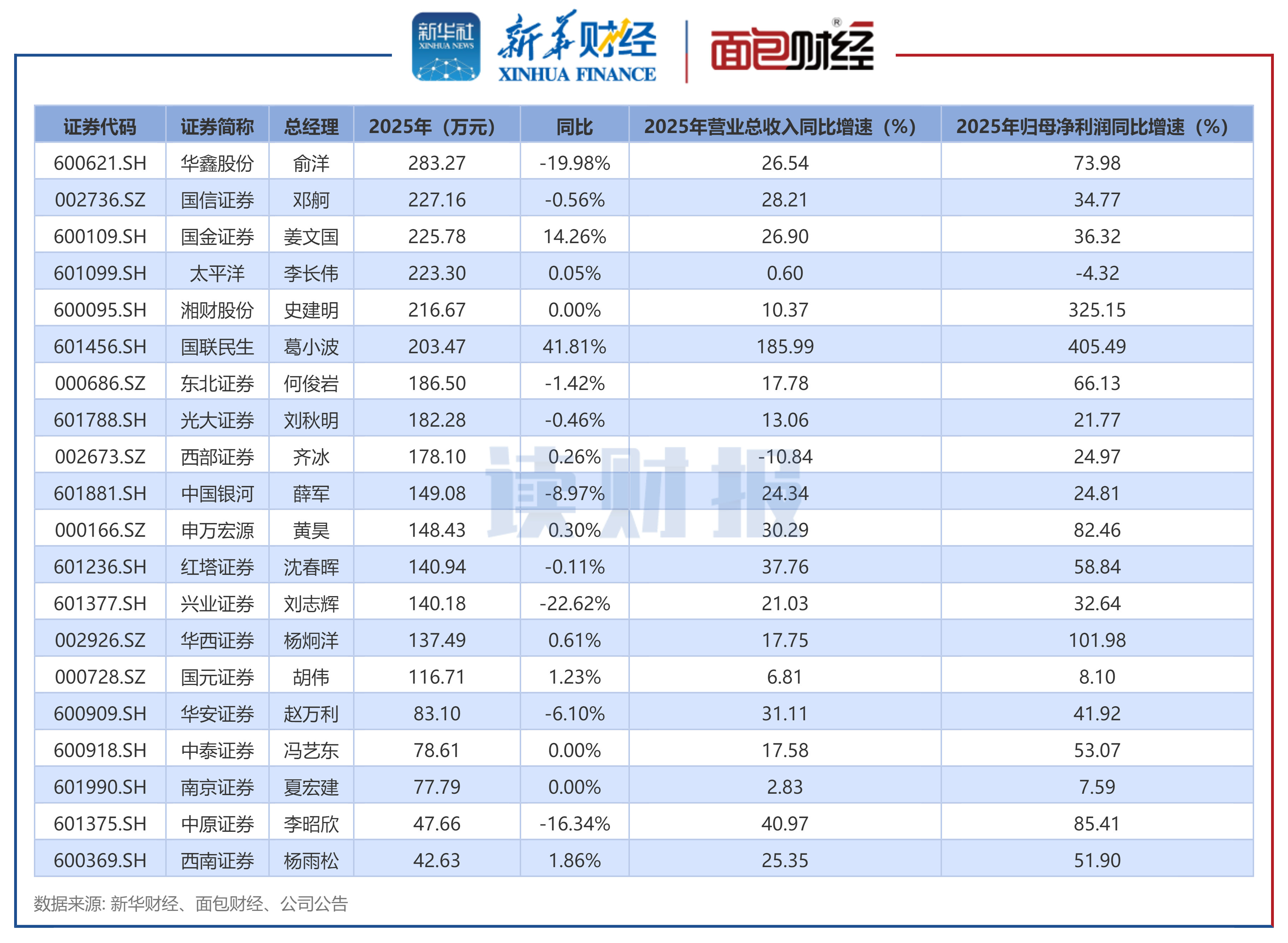 具体来看,华鑫股份俞洋、国信证券邓舸、国金证券姜文国等6位总经理的2025年薪酬超过200万元。