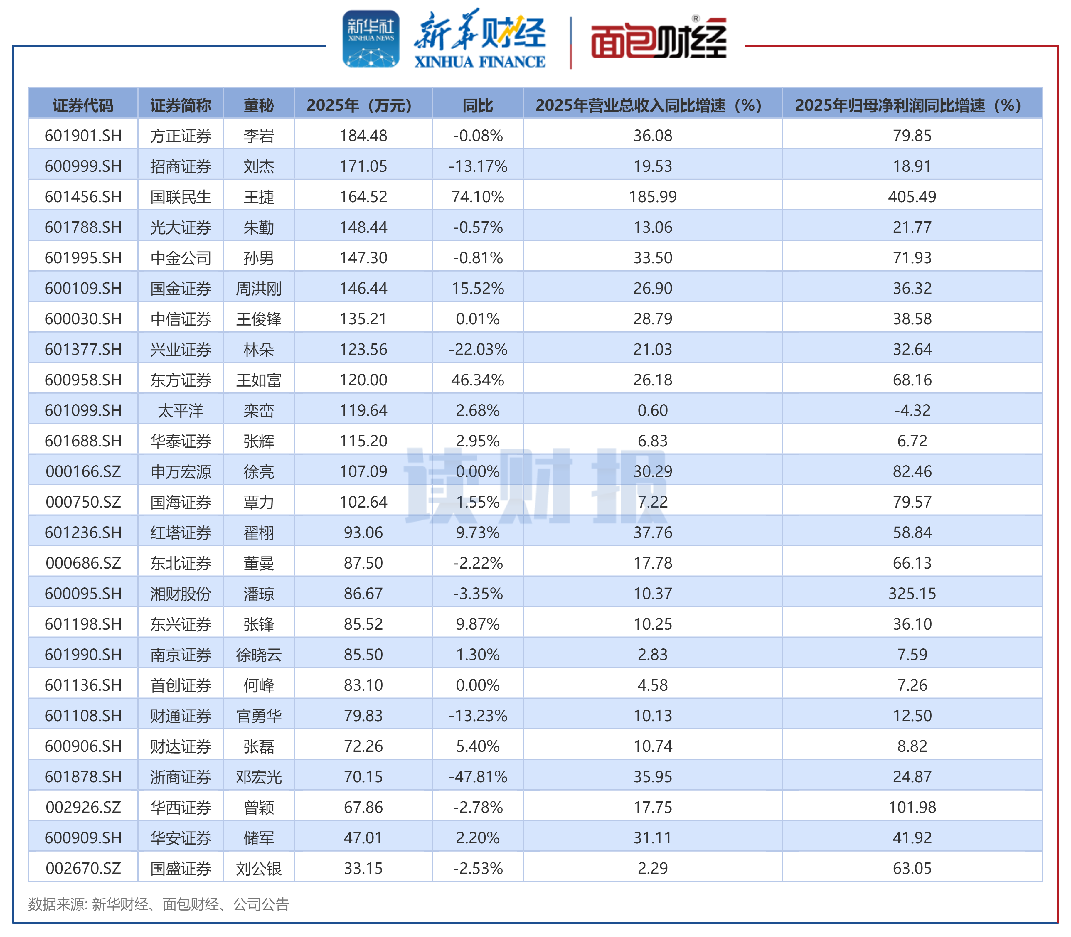 相比之下,兴业证券刘志辉、华鑫股份俞洋的2025年薪酬降幅超过19%,两家券商2025年归母净利润分别同比增长32.64%、73.98%。