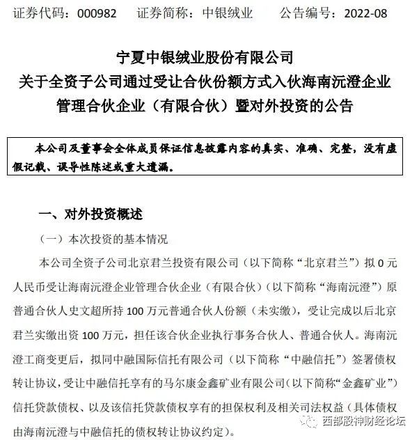 最新、最值得关注的事项,是2022年2月26日公司发布公告《中银绒业:宁夏中银绒业股份有限公司关于全资子公司通过受让合伙份额方式入伙海南沅澄企业管理合伙企业(有限合伙)暨对外投资的公告》。