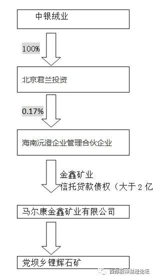 2、2015年,众和股份向中融信托要求贷款2亿元,一年期利率17%,过期罚息150%。双方约定由众合股份以金鑫矿业矿权作为抵押。2016年到期后众合未能按期归还贷款,只得把金鑫矿业质押给中融信托。随后,中融将金鑫矿业交给兴业矿业开发盘活,但兴业矿业也是败家子一个,缺乏战略眼光,接手后并未认真对待,导致金鑫矿业至今沉睡,错失了本轮全球锂电产业大发展的机遇。因此,中融和恒天才联合收购重组了中银绒业,并进军四川阿坝。目前看,是希望将中银打造为旗下的锂电产业发展平台。