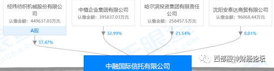 但在运行中,中植系实控中融,中融信托一直是中植系的重要资金平台。理由是,尽管大股东是经纬纺机,但与二股东中植企业集团仅4.48%的股权差距。三股东哈尔滨投资是国资股东,而四股东则是沈阳安泰达商贸占8.01%,其实际控制人则是