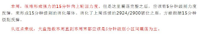 这是周一下午解盘内容,本人告诉本周难以形成15分钟级别向上轮回套力度,只能5分钟级别小区间震荡消化。今天是周五,本周最后一天,本人的预测完全照入了现实。