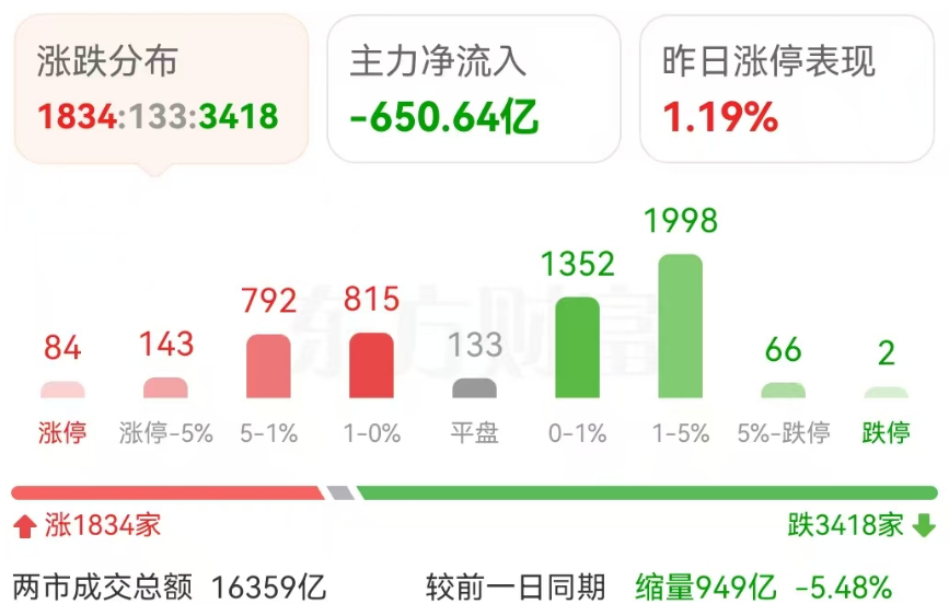 市场今天呈现反复震荡的态势。截止收盘,1834家上涨,3418家下跌,84家涨停,2家跌停,5%涨跌家数比是143:66,看似多头占据了绝对的优势,但实际情况却不容乐观。两市总成交超过1.63万亿,较上一交易日缩量949亿,收盘主力资金净流出-650.64亿,说明市场中又有资金在选择逢高兑现,接下来注意观察成交量,以便可以随机应变。