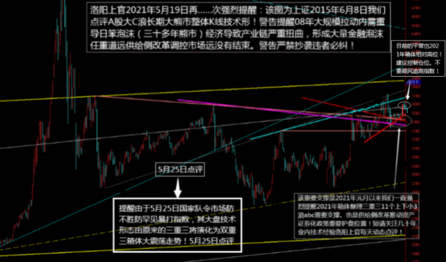 综上所述毫无疑问导致A股(详情关注5月17日重要点评)长期持续印证08年以来【重导日笨房地产泡沫股市运行长达三十多年熊市】我们点评A股进入长期熊市A、B、C调整。目前处于供给侧改革调控市场,推动资产证券化化解市场风险(调控市场稳定健康运行)所进行的漫长大C浪(C2浪里第5子浪错综复杂箱体整理反弹)运行过程中。那大盘持续印证5月25日点评围绕3585持续震荡已达13个交易日重要时间窗口。绝大多个股持续付出残酷下跌代价,技术持续发出的警告信号?端午节后大盘会怎么走?对此我们仍坚持近期点评观点。再次提醒基于不健康盘面持续升温、技术持续警告。及市场迫切需要供给侧改革推动资产证券化。仍迫切需要大主力继续维稳护盘?我们认为端午节后,大盘伴随大主力维稳护盘循序渐进下探2021年箱体下轨3328恐是主基调。短线上看端午节后下周二大盘下探考验3555附近支撑(充分印证),经短暂整理继续下探可能性极大。因此痛定思痛策略上建议控制仓位防范大主力无节奏操控逆势拉升。盘面不健康不要盲目跟风主力操控指数。防范指数回落继续对绝大多个股股价构成杀跌冲击(以上点评 仅供参考)。