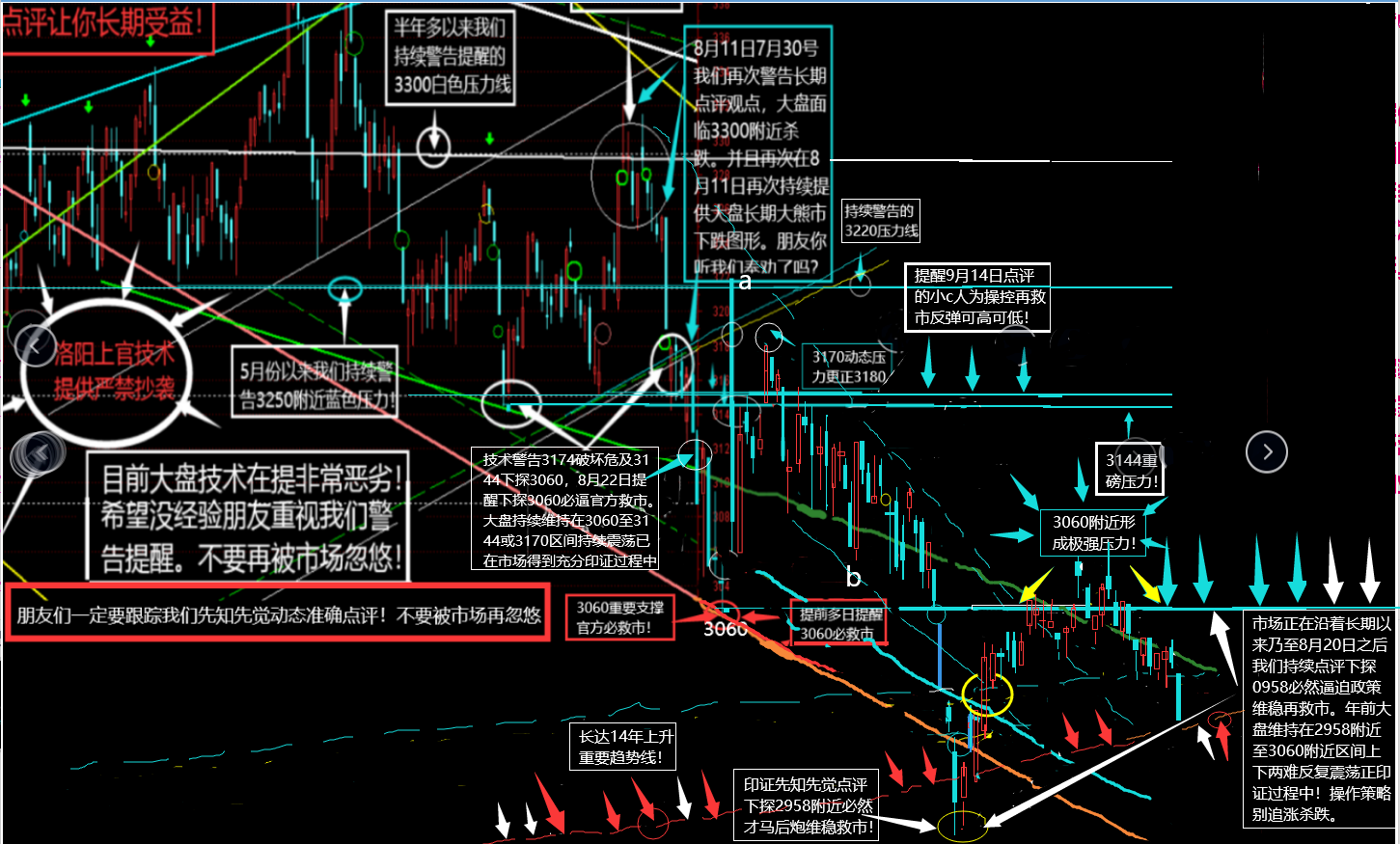 那大盘不折不扣印证我们点评主力配合政才维稳马后炮救市,毁灭性破坏了3060技术重要转折点,又毁灭性破坏了10月份9日我们先知先觉事先警告提醒的3000点更重要技术支撑。试问大盘未来乃至春节前以及近日咋运行?特别提醒大盘运行不会改变2015年6月8日【5170点】以来我们长期持续警告提醒的人为操控维稳循序渐进特大级别C4浪错综复杂下跌。那大盘毁灭破坏3060引发暴跌危及3000点重要支撑又遭破坏春节之前大盘咋运行?几十年业内技术经验洛阳上官特别提醒大盘毁灭性破坏3060重要转折点,再次毁灭性破坏多年动态3000点重要支撑。必然引发奸关层【恐慌】高度重视。在本周末想方设法再次进行维稳救市。因为大盘毁灭性破坏3060、3000点之后,将会危及2019年形成的上升趋势2958这个更重要动态技术点位。技术警告如果再次有效破坏2958附近长达15年非常重……要动态支撑,必然引发市场更……大恐慌。将给股市场带来更大恐慌杀跌。也必将对当前危难经济构成雪上加霜。因此这种强烈警告信号必然引起奸关层再次高度重视展开反反复复维稳救市可能性极大。因此迫于【纯技术】基本面迫切需要维稳救市,大盘年前伴随政才维稳维持在2958【动态点位】至3060附近区间反复弱势震荡可能性极大【充分印证】。那大盘危及2958下周主力配合政才维稳护盘咋操作?警告提醒大盘伴随政才维稳再次进入局部震荡千万不要追涨杀跌。千万不要在2958附近盲目杀跌。不过被毁灭破坏的3000点将会构成极大压力【正在印证过程中】压制大盘反弹不会一帆风顺。我们建议长期不听奉劝高位重仓套牢朋友。把握机会选择基本面不错,技术状态不错、上升潜力极大市场热门股低吸调仓换股或补仓自救。详情关注每天收盘和直播间动态点评,为你提供深谋远虑前瞻性连……续剧点评为你提供帮助。【以上点评 仅供参考!】