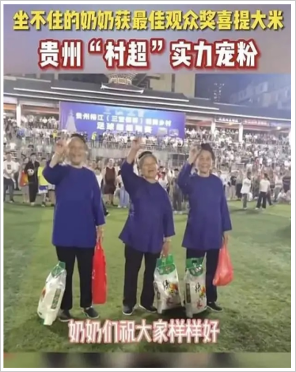 韩乔生解说的那场比赛中,三位专注看球、全力鼓掌的老奶奶送被授予 “最佳观众奖”,奖品是每人一袋大米。