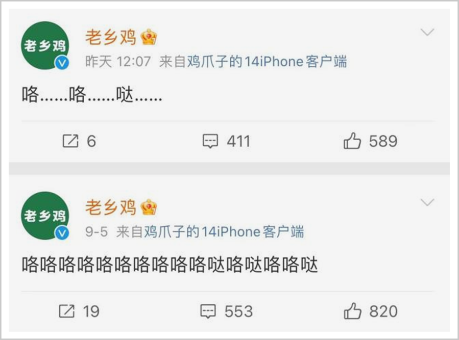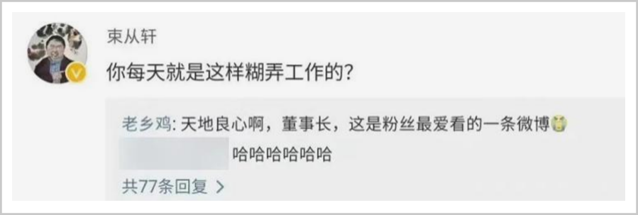 随后老乡鸡邀请岳云鹏成为形象代言人;老乡鸡品牌官方微博账号,也开始了长达3年的“咯咯哒”,束从轩不时下场互动;束从轩还参加综艺,扩大自身和老乡鸡的知名度。