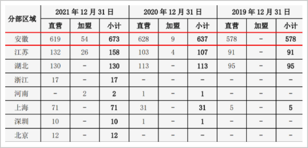 据2022年初提交的招股书,老乡鸡2021年在华东地区保持了较高的毛利率达19.1%,但在华中地区只有3.51%,华南、华北都是巨大的负数,其湖北、广东、北京等分公司都是亏损。
