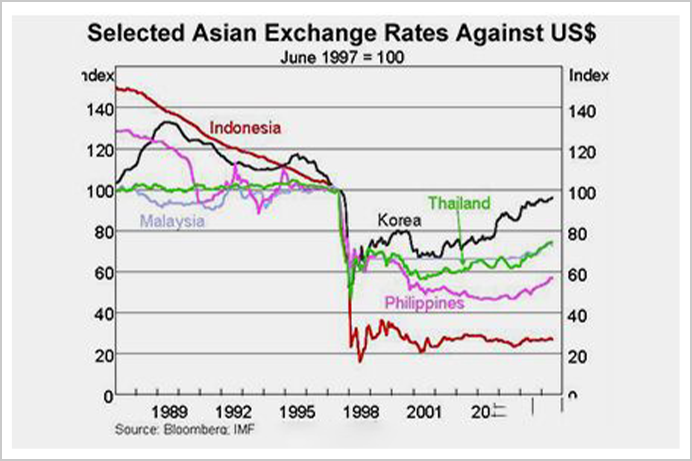 ▲1998年韩元与东南亚货币跌幅比较
