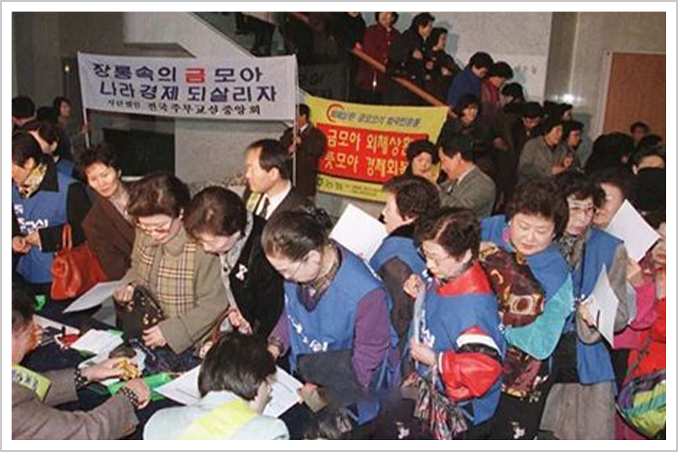 就在几个月前,亚洲金融危机爆发,韩元几近崩溃,韩国经济也滑向深渊。危难时刻,人们自发组织起来,发动了一场向国家捐献黄金和外币的运动。